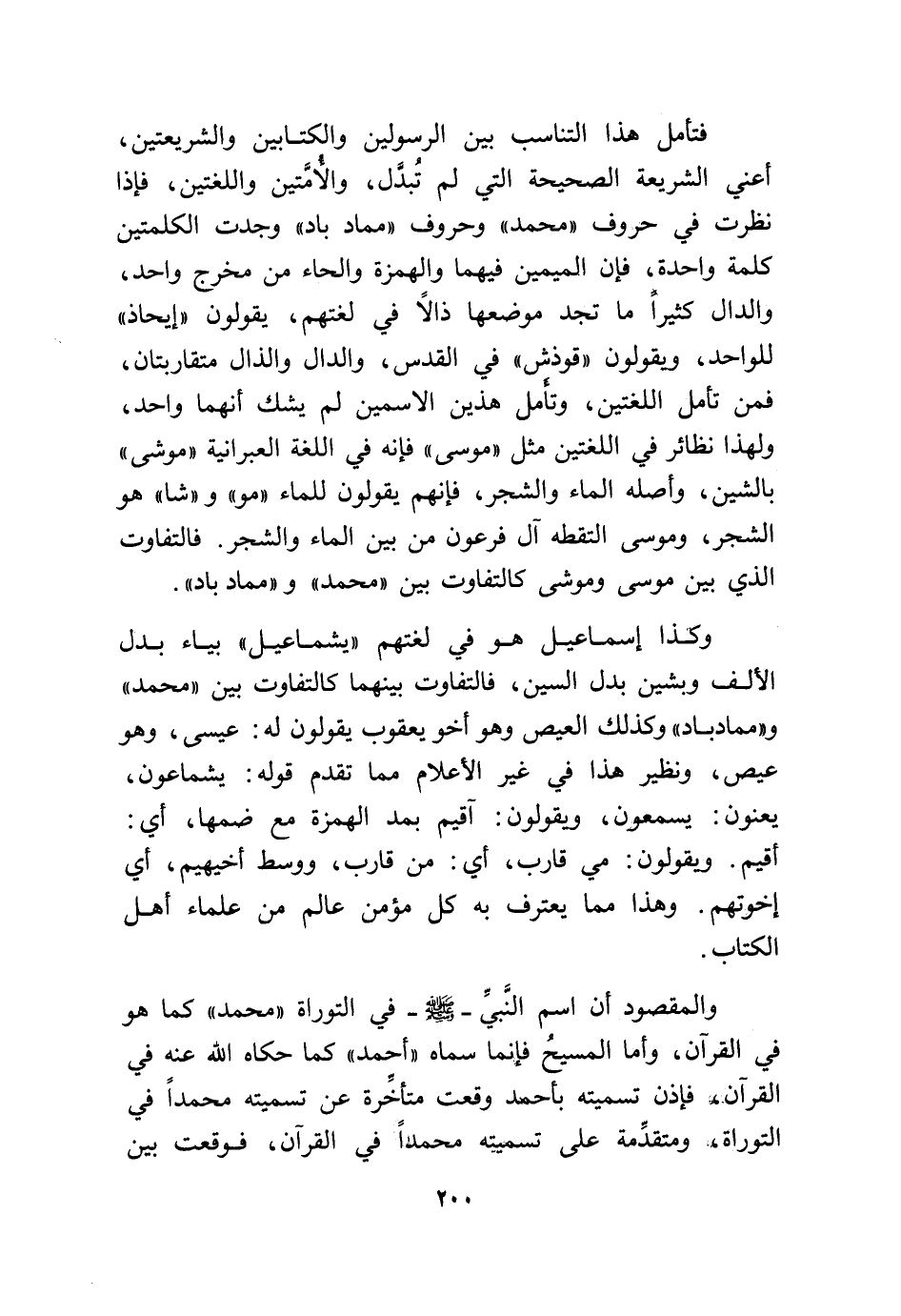 فَتَأمل هَذَا التناسب بَين الرسولين والكتابين والشريعتين أَعنِي الشَّرِيعَة الصَّحِيحَة الَّتِي لم تبدل والأمتين واللغتين فَإِذا نظرت فِي حُرُوف مُحَمَّد وحروف مماد باد وجدت الْكَلِمَتَيْنِ كلمة وَاحِدَة فَإِن الميمين فيهمَا والهمزة والحاء من مخرج وَاحِد وَالدَّال كثيرا مَا تَجِد موضعهَا ذالاً فِي لغتهم يَقُولُونَ إيحاذ للْوَاحِد وَيَقُولُونَ قوذش فِي الْقُدس وَالدَّال والذال متقاربتان فَمن تَأمل اللغتين وَتَأمل هذَيْن الاسمين لم يشك أَنَّهُمَا وَاحِد وَلِهَذَا نَظَائِر فِي اللغتين مثل مُوسَى فَإِنَّهُ فِي اللُّغَة العبرانية موشى بالشين وَأَصله المَاء وَالشَّجر فَإِنَّهُم يَقُولُونَ للْمَاء مو وشا هُوَ الشّجر ومُوسَى التقطه آل فِرْعَوْن من بَين المَاء وَالشَّجر فالتفاوت الَّذِي بَين مُوسَى وموشى كالتفاوت بَين مُحَمَّد ومماد باد