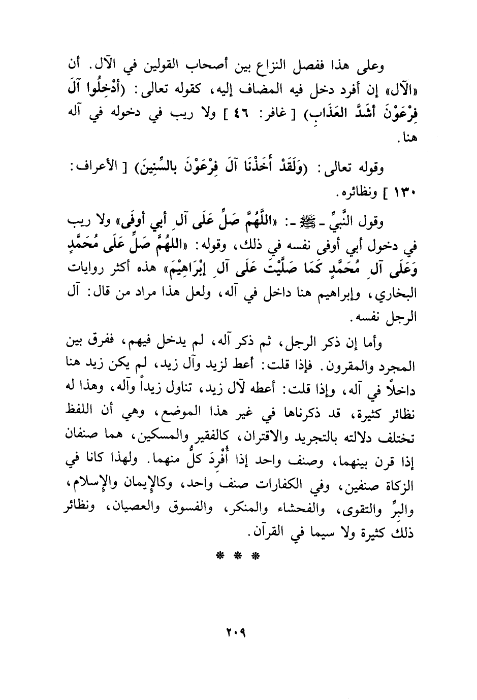 وعَلى هَذَا ففصل النزاع بَين أَصْحَاب الْقَوْلَيْنِ فِي الْآل أَن الْآل إِن أفرد دخل فِيهِ الْمُضَاف إِلَيْهِ كَقَوْلِه تَعَالَى {أَدْخِلُوا آلَ فِرْعَوْنَ أَشَدَّ الْعَذَابِ} غَافِر 46 وَلَا ريب فِي دُخُوله فِي آله هُنَا