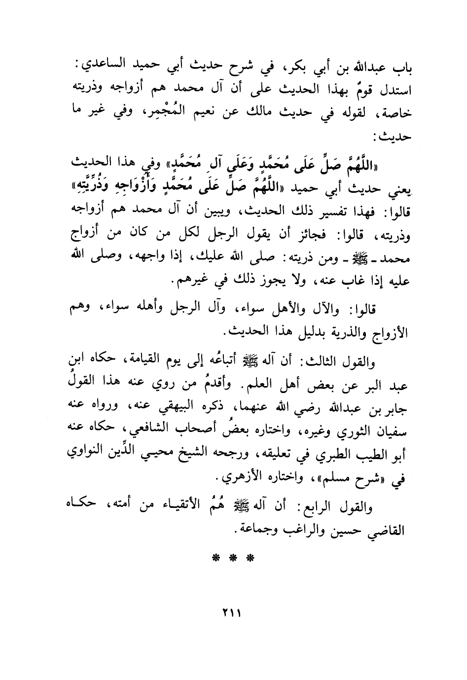بَاب عبد الله بن أبي بكر فِي شرح حَدِيث أبي أَحْمد حميد السَّاعِدِيّ اسْتدلَّ قوم بِهَذَا الحَدِيث على أَن آل مُحَمَّد هم وأزواجه وَذريته خَاصَّة لقَوْله فِي حَدِيث مَالك عَن نعيم المجمر وَفِي غير مَا حَدِيث