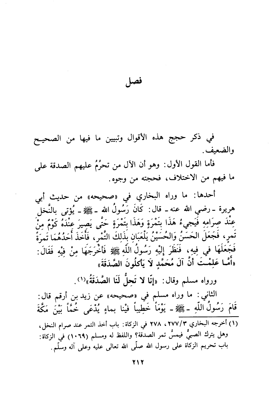 أَحدهَا مَا رَوَاهُ البُخَارِيّ فِي صَحِيحه من حَدِيث أبي هُرَيْرَة رَضِي الله عَنهُ قَالَ كَانَ رَسُول الله صلى الله عَلَيْهِ وَسلم يُؤْتى بِالنَّخْلِ عِنْد صرامه فَيَجِيء هَذَا بتمرة وَهَذَا بتمرة حَتَّى يصير عِنْده كوم من تمر فَجعل الْحسن وَالْحُسَيْن يلعبان بذلك التَّمْر فَأخذ أَحدهمَا تَمْرَة فَجَعلهَا فِي فِيهِ فَنظر إِلَيْهِ رَسُول الله صلى الله عَلَيْهِ وَسلم فأخرجها من فِيهِ فَقَالَ أما علمت أَن آل مُحَمَّد لَا يَأْكُلُون الصَّدَقَة