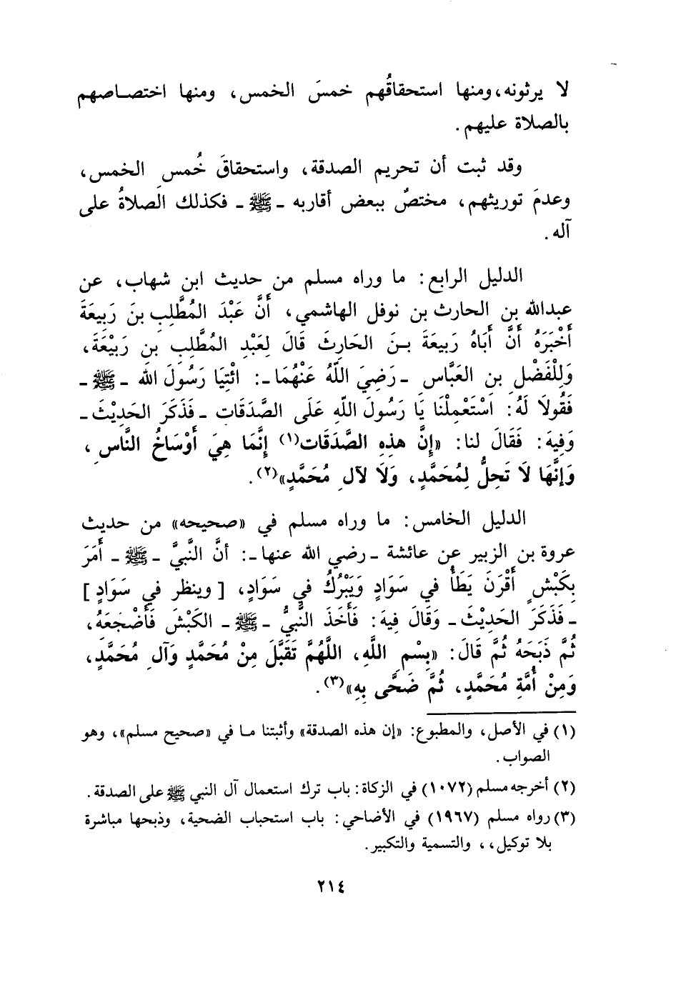 الدَّلِيل الرَّابِع مَا رَوَاهُ مُسلم من حَدِيث ابْن شهَاب عَن عبد الله بن الْحَارِث بن نَوْفَل الْهَاشِمِي أَن عبد الْمطلب بن ربيعَة أخبرهُ أَن أَبَاهُ ربيعَة بن الْحَارِث قَالَ لعبد الْمطلب بن ربيعَة وللفضل بن الْعَبَّاس رَضِي الله عَنْهُمَا ائتيا رَسُول الله صلى الله عَلَيْهِ وَسلم فقولا لَهُ استعملنا يَا رَسُول الله على الصَّدقَات فَذكر الحَدِيث وَفِيه فَقَالَ لنا إِن هَذِه الصَّدقَات إِنَّمَا هِيَ أوساخ النَّاس وَإِنَّهَا لَا تحل لمُحَمد وَلَا لآل مُحَمَّد