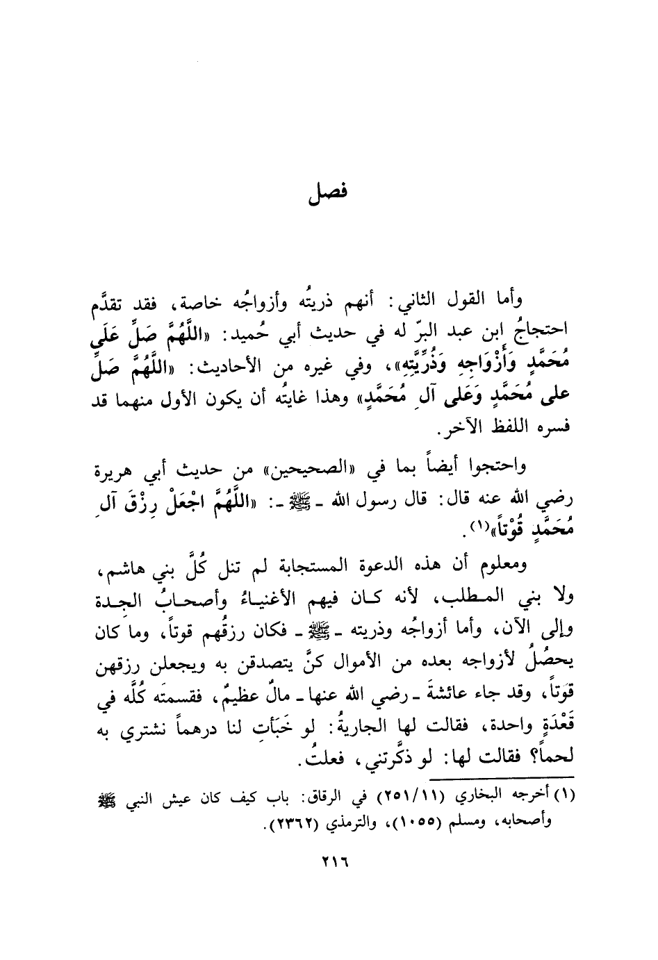 وَأما القَوْل الثَّانِي أَنهم ذُريَّته وأزواجه خَاصَّة فقد تقدم احتجاج ابْن عبد الْبر لَهُ فِي حَدِيث أبي حميد اللَّهُمَّ صل على مُحَمَّد وأزواجه وَذريته وَفِي غَيره من الْأَحَادِيث اللَّهُمَّ صل على مُحَمَّد وعَلى آل مُحَمَّد وَهَذَا غَايَته أَن يكون الأول مِنْهُمَا قد فسره اللَّفْظ الآخر