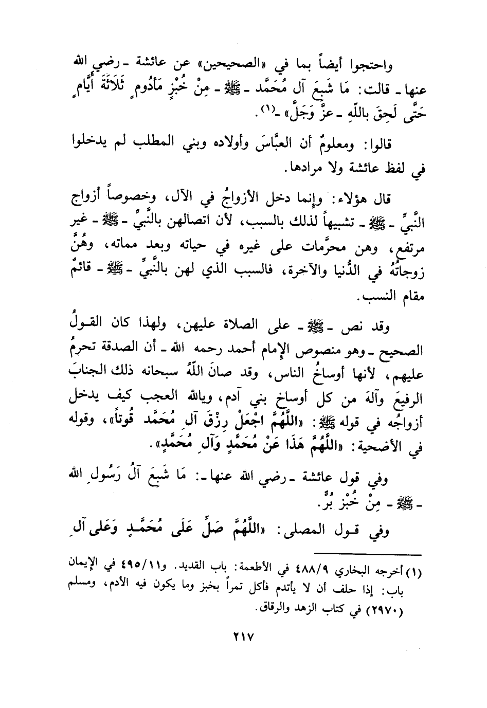 وَقد نَص صلى الله عَلَيْهِ وَسلم على الصَّلَاة عَلَيْهِنَّ وَلِهَذَا كَانَ القَوْل الصَّحِيح وَهُوَ مَنْصُوص الإِمَام أَحْمد رَحمَه الله إِن الصَّدَقَة تحرم عَلَيْهِم لِأَنَّهَا أوساخ النَّاس وَقد صان الله سُبْحَانَهُ ذَلِك الجناب الرفيع وَآله من كل أوساخ بني آدم وَيَا لله الْعجب كَيفَ يدْخل أَزوَاجه فِي قَوْله صلى الله عَلَيْهِ وَسلم اللَّهُمَّ اجْعَل رزق آل مُحَمَّد قوتا وَقَوله فِي الْأُضْحِية اللَّهُمَّ هَذَا عَن مُحَمَّد وَآل مُحَمَّد