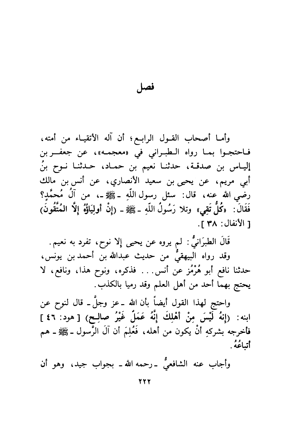وَأما أَصْحَاب القَوْل الرَّابِع أَن آله الأتقياء من أمته فاحتجوا بِمَا رَوَاهُ الطَّبَرَانِيّ فِي مُعْجَمه عَن جَعْفَر بن إلْيَاس بن صَدَقَة حَدثنَا نعيم بن حَمَّاد حَدثنَا نوح بن أبي مَرْيَم عَن يحيى بن سعيد الْأنْصَارِيّ عَن أنس بن مَالك رَضِي الله عَنهُ قَالَ سُئِلَ رَسُول الله صلى الله عَلَيْهِ وَسلم من آل مُحَمَّد فَقَالَ كل تَقِيّ وتلا رَسُول الله صلى الله عَلَيْهِ وَسلم {إِنْ أَوْلِيَاؤُهُ إِلا المتقون} الْأَنْفَال 38
