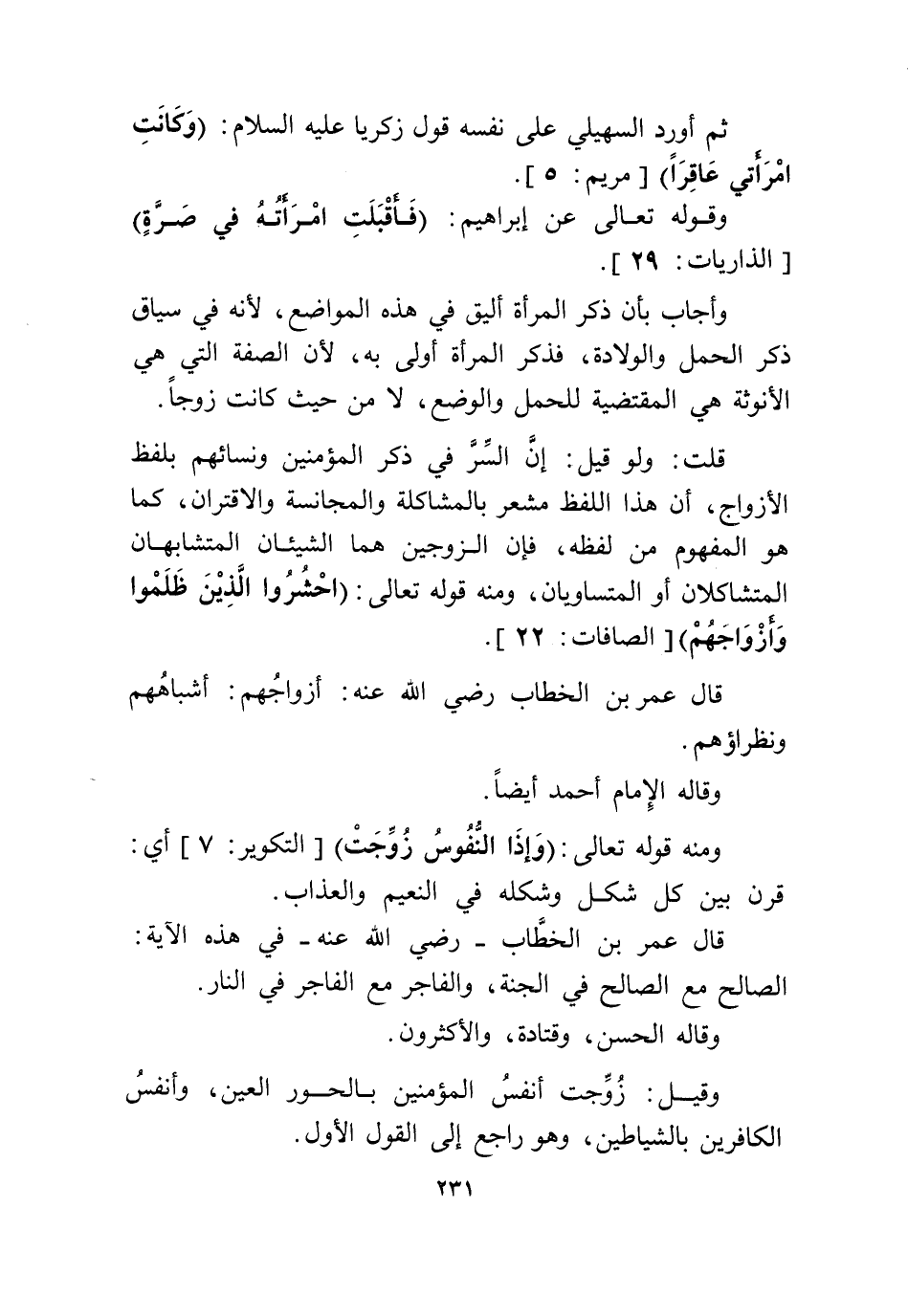 وَمِنْه قَوْله تَعَالَى {وَإِذَا النُّفُوسُ زُوِّجَتْ} التكوير 7 أَي قرن بَين كل شكل وشكله فِي النَّعيم وَالْعَذَاب