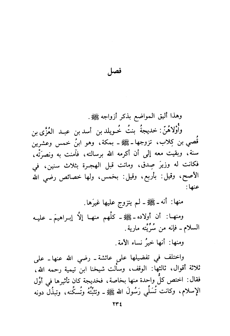 وَاخْتلف فِي تفضيلها على عَائِشَة رَضِي الله عَنْهَا على ثَلَاثَة أَقْوَال ثَالِثهَا الْوَقْف وَسَأَلت شَيخنَا ابْن تَيْمِية رَحمَه الله فَقَالَ اخْتصَّ كل وَاحِدَة مِنْهَا بِخَاصَّة فخديجة كَانَ تأثيرها فِي أول الْإِسْلَام وَكَانَت تسلي رَسُول الله صلى الله عَلَيْهِ وَسلم وتثبته وتسكنه وتبذل دونه