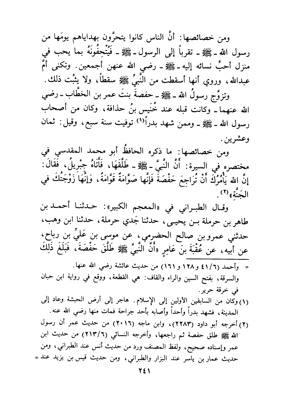 وَمن خصائصها مَا ذكره الْحَافِظ أَبُو مُحَمَّد الْمَقْدِسِي فِي مُخْتَصره فِي السِّيرَة أَن النَّبِي صلى الله عَلَيْهِ وَسلم طَلقهَا فَأَتَاهُ جِبْرِيل فَقَالَ إِن الله يَأْمُرك أَن تراجع حَفْصَة فَإِنَّهَا صَوَّامَة قَوَّامَة وَإِنَّهَا زَوجتك فِي الْجنَّة