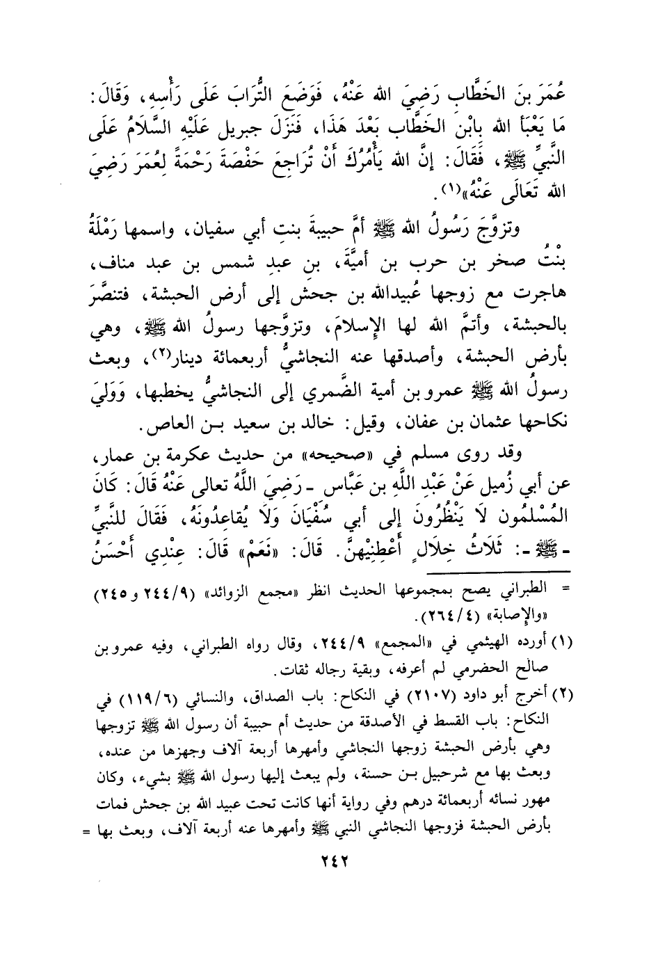وَتزَوج رَسُول الله صلى الله عَلَيْهِ وَسلم أم حَبِيبَة بنت أبي سُفْيَان وَاسْمهَا رَملَة بنت صَخْر بن حَرْب بن أُميَّة بن عبد شمس بن عبد منَاف هَاجَرت مَعَ زَوجهَا عبيد الله بن جحش إِلَى أَرض الْحَبَشَة فَتَنَصَّرَ بِالْحَبَشَةِ وَأتم الله لَهَا الْإِسْلَام وَتَزَوجهَا رَسُول الله صلى الله عَلَيْهِ وَسلم وَهِي بِأَرْض الْحَبَشَة وَأصْدقهَا عَنهُ النَّجَاشِيّ أَرْبَعمِائَة دِينَار // إِسْنَاده صَحِيح // وَبعث رَسُول الله صلى الله عَلَيْهِ وَسلم عَمْرو بن أُميَّة الضمرِي إِلَى النَّجَاشِيّ يخطبها وَولى نِكَاحهَا عُثْمَان بن عَفَّان وَقيل خَالِد بن سعيد بن الْعَاصِ