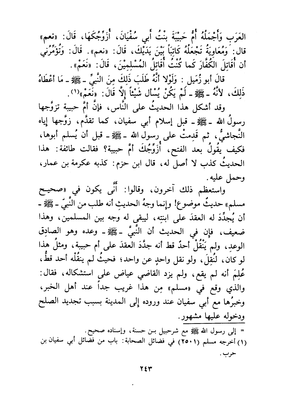 واستعظم ذَلِك آخَرُونَ وَقَالُوا أَنى يكون فِي صَحِيح مُسلم حَدِيث مَوْضُوع وَإِنَّمَا وَجه الحَدِيث أَنه طلب من النَّبِي صلى الله عَلَيْهِ وَسلم أَن يجدد لَهُ العقد على ابْنَته ليبقى لَهُ وَجه بَين الْمُسلمين وَهَذَا ضَعِيف فَإِن فِي الحَدِيث أَن النَّبِي صلى الله عَلَيْهِ وَسلم وعده وَهُوَ الصَّادِق الْوَعْد وَلم ينْقل أحد قطّ أَنه جدد العقد على أم حَبِيبَة وَمثل هَذَا لَو كَانَ لنقل وَلَو نقل وَاحِد عَن وَاحِد فَحَيْثُ لم يَنْقُلهُ أحد قطّ علم أَنه لم يَقع وَلم يزدْ القَاضِي عِيَاض على استشكاله فَقَالَ وَالَّذِي وَقع فِي مُسلم من هَذَا غَرِيب جدا عِنْد أهل الْخَبَر وخبرها مَعَ أبي سُفْيَان عِنْد وُرُوده إِلَى الْمَدِينَة بِسَبَب تَجْدِيد الصُّلْح ودخوله عَلَيْهَا مَشْهُور