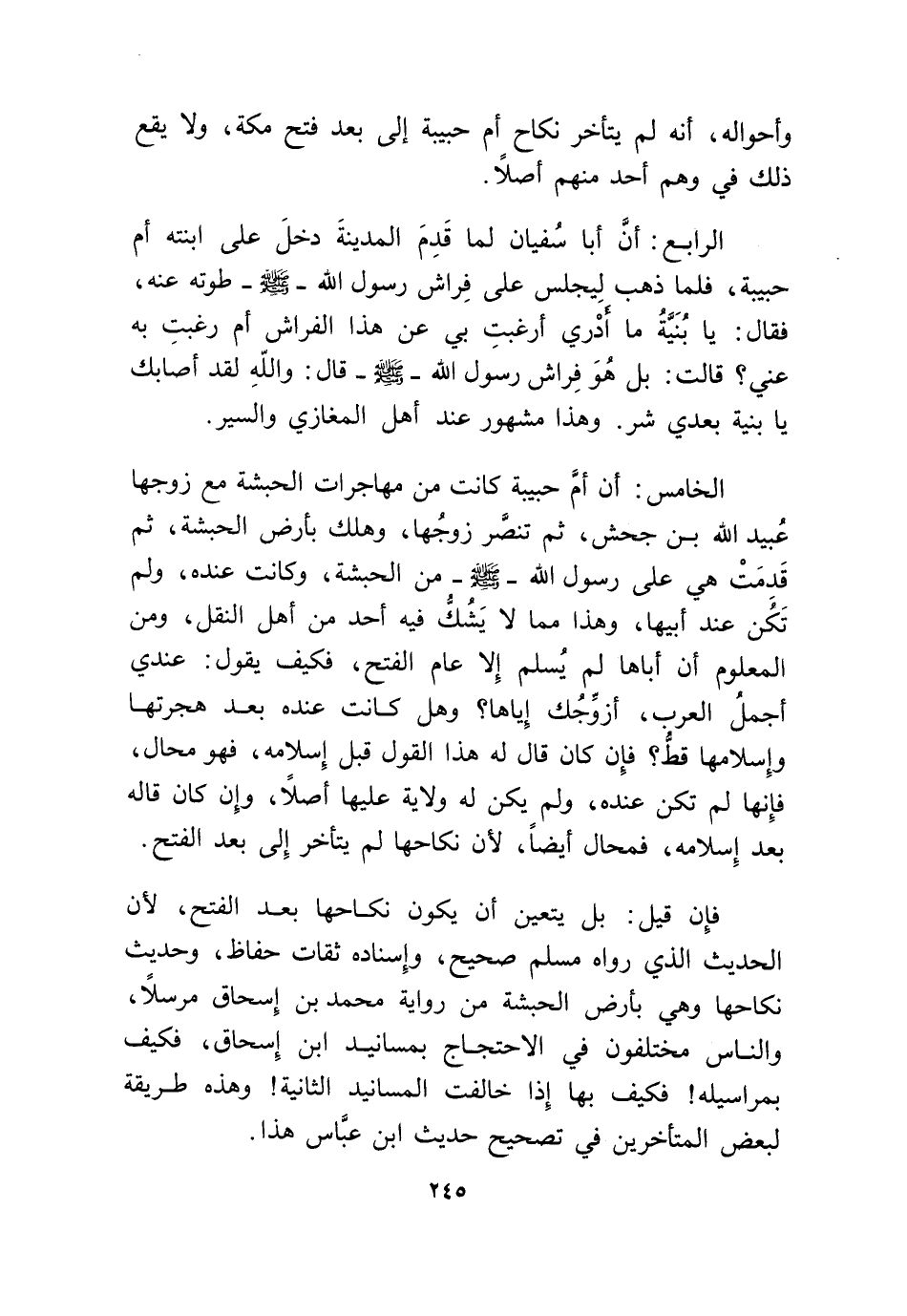 الْخَامِس أَن أم حَبِيبَة كَانَت من مهاجرات الْحَبَشَة مَعَ زَوجهَا عبيد الله بن جحش ثمَّ تنصر زَوجهَا وَهلك بِأَرْض الْحَبَشَة ثمَّ قدمت هِيَ على رَسُول الله صلى الله عَلَيْهِ وَسلم من الْحَبَشَة وَكَانَت عِنْده وَلم تكن عِنْد أَبِيهَا وَهَذَا مِمَّا لَا يشك فِيهِ أحد من أهل النَّقْل وَمن الْمَعْلُوم أَن أَبَاهَا لم يسلم إِلَّا عَام الْفَتْح فَكيف يَقُول عِنْدِي أجمل الْعَرَب أزَوجك إِيَّاهَا وَهل كَانَت عِنْده بعد هجرتهَا وإسلامها قطّ فَإِن كَانَ قَالَ لَهُ هَذَا القَوْل قبل إِسْلَامه فَهُوَ محَال فَإِنَّهَا لم تكن عِنْده وَلم يكن لَهُ ولَايَة عَلَيْهَا أصلا وَإِن كَانَ قَالَه بعد إِسْلَامه فمحال أَيْضا لِأَن نِكَاحهَا لم يتَأَخَّر إِلَى بعد الْفَتْح