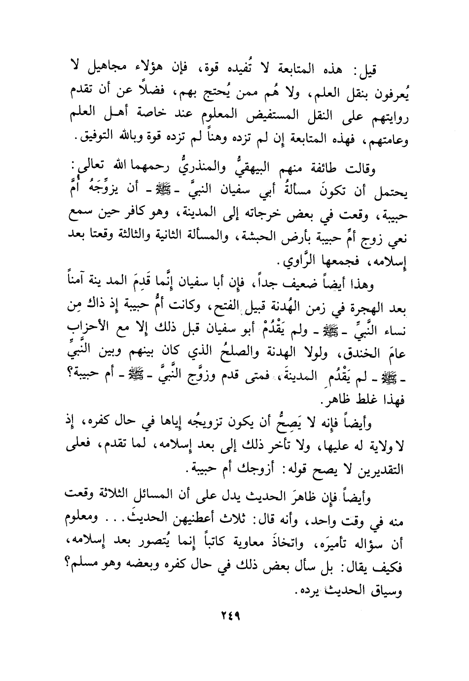 وَهَذَا أَيْضا ضَعِيف جدا فَإِن أَبَا سُفْيَان إِنَّمَا قدم الْمَدِينَة آمنا بعد الْهِجْرَة فِي زمن الْهُدْنَة قبيل الْفَتْح وَكَانَت أم حَبِيبَة إِذْ ذَاك من نسَاء النَّبِي صلى الله عَلَيْهِ وَسلم وَلم يقدم أَبُو سُفْيَان قبل ذَلِك إِلَّا مَعَ الْأَحْزَاب عَام الخَنْدَق وَلَوْلَا الْهُدْنَة وَالصُّلْح الَّذِي كَانَ بَينهم وَبَين النَّبِي صلى الله عَلَيْهِ وَسلم لم يقدم الْمَدِينَة فَمَتَى قدم وَزوج النَّبِي صلى الله عَلَيْهِ وَسلم أم حَبِيبَة فَهَذَا غلط ظَاهر