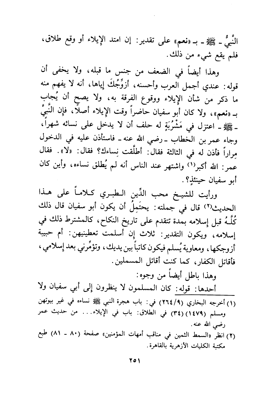وَهَذَا أَيْضا فِي الضعْف من جنس مَا قبله وَلَا يخفى أَن قَوْله عِنْدِي أجمل الْعَرَب وَأحسنه أزَوجك إِيَّاهَا أَنه لَا يفهم مِنْهُ مَا ذكر من شَأْن الْإِيلَاء وَوُقُوع الْفرْقَة بِهِ وَلَا يَصح أَن يُجَاب ب نعم وَلَا كَانَ أَبُو سُفْيَان حَاضرا وَقت الْإِيلَاء أصلا فَإِن النَّبِي صلى الله عَلَيْهِ وَسلم اعتزل فِي مشربَة لَهُ حلف أَن لَا يدْخل على نِسَائِهِ شهرا وَجَاء عمر بن الْخطاب رَضِي الله عَنهُ فَاسْتَأْذن عَلَيْهِ فِي الدُّخُول مرَارًا فَأذن لَهُ فِي الثَّالِثَة فَقَالَ أطلقت نِسَاءَك فَقَالَ لَا فَقَالَ عمر الله أكبر واشتهر عِنْد النَّاس أَنه لم يُطلق نِسَاءَهُ وَأَيْنَ كَانَ أَبُو سُفْيَان حِينَئِذٍ