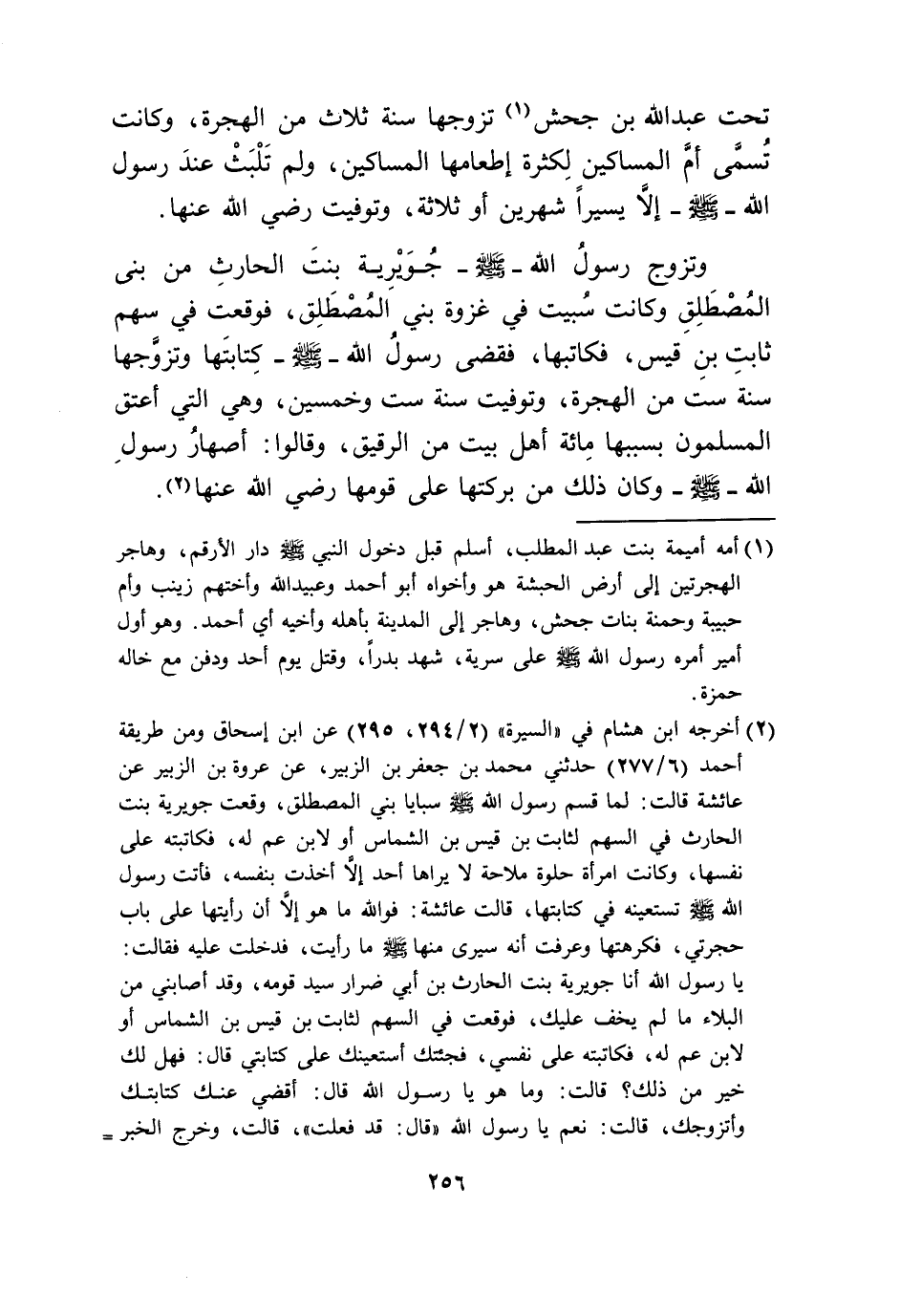 وَتزَوج رَسُول الله صلى الله عَلَيْهِ وَسلم جوَيْرِية بنت الْحَارِث من بني المصطلق وَكَانَت سُبيت فِي غَزْوَة بني المصطلق فَوَقَعت فِي سهم ثَابت بن قيس فكاتبها فَقضى رَسُول الله صلى الله عَلَيْهِ وَسلم كتَابَتهَا وَتَزَوجهَا سنة سِتّ من الْهِجْرَة وَتوفيت سنة سِتّ وَخمسين وَهِي الَّتِي أعتق الْمُسلمُونَ بِسَبَبِهَا مائَة أهل بَيت من الرَّقِيق وَقَالُوا أَصْهَار رَسُول الله صلى الله عَلَيْهِ وَسلم وَكَانَ ذَلِك من بركتها على قَومهَا رَضِي الله عَنْهَا // إِسْنَاده صَحِيح //