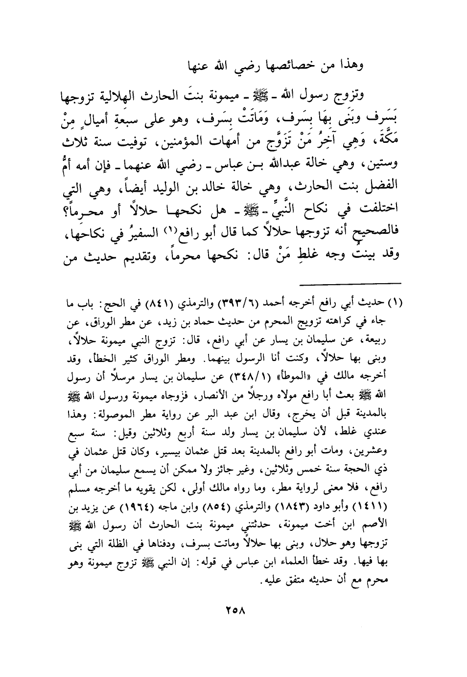 وَتزَوج رَسُول الله صلى الله عَلَيْهِ وَسلم مَيْمُونَة بنت الْحَارِث الْهِلَالِيَّة تزَوجهَا بسرف وَبنى بهَا بسرف وَمَاتَتْ بسرف وَهُوَ على سَبْعَة أَمْيَال من مَكَّة وَهِي آخر من تزوج من أُمَّهَات الْمُؤمنِينَ توفيت سنة ثَلَاث وَسِتِّينَ وَهِي خَالَة عبد الله بن عَبَّاس رَضِي الله عَنْهُمَا فَإِن أمه أم الْفضل بنت الْحَارِث وَهِي خَالَة خَالِد بن الْوَلِيد أَيْضا وَهِي الَّتِي اخْتلفت فِي نِكَاح النَّبِي صلى الله عَلَيْهِ وَسلم هَل نَكَحَهَا حَلَالا أَو محرما فَالصَّحِيح أَنه تزَوجهَا حَلَالا كَمَا قَالَ أَبُو رَافع السفير فِي نِكَاحهَا وَقد بيّنت وَجه غلط من قَالَ نَكَحَهَا محرما وَتَقْدِيم حَدِيث من