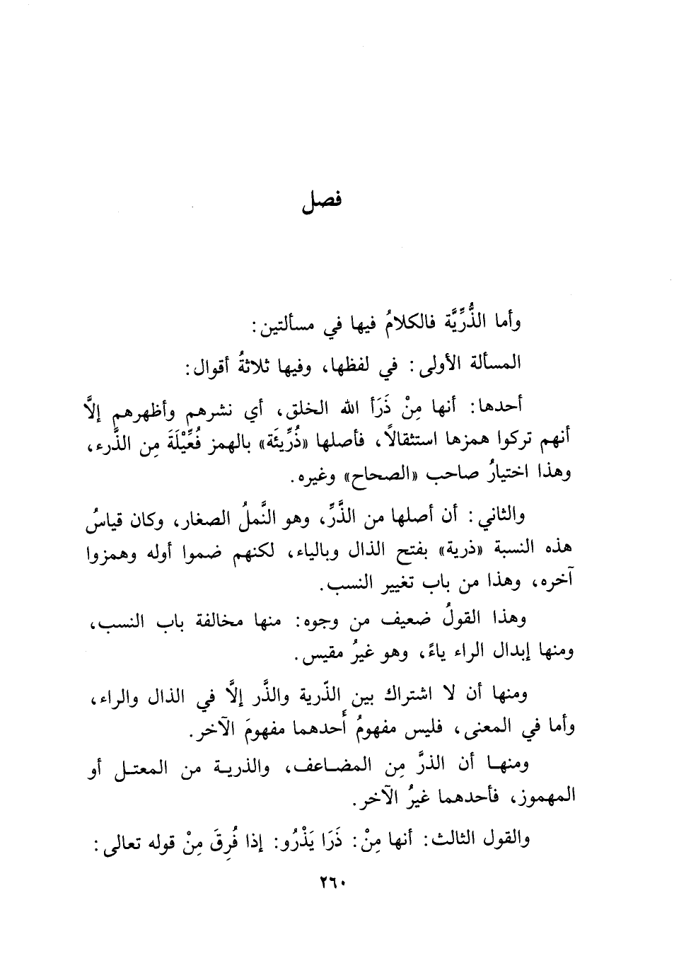 وَالثَّانِي أَن أَصْلهَا من الذَّر وَهُوَ النَّمْل الصغار وَكَانَ قِيَاس هَذِه النِّسْبَة ذُرِّيَّة بِفَتْح الذَّال وبالياء لكِنهمْ ضمُّوا أَوله وهمزوا آخِره وَهَذَا من بَاب تَغْيِير النّسَب