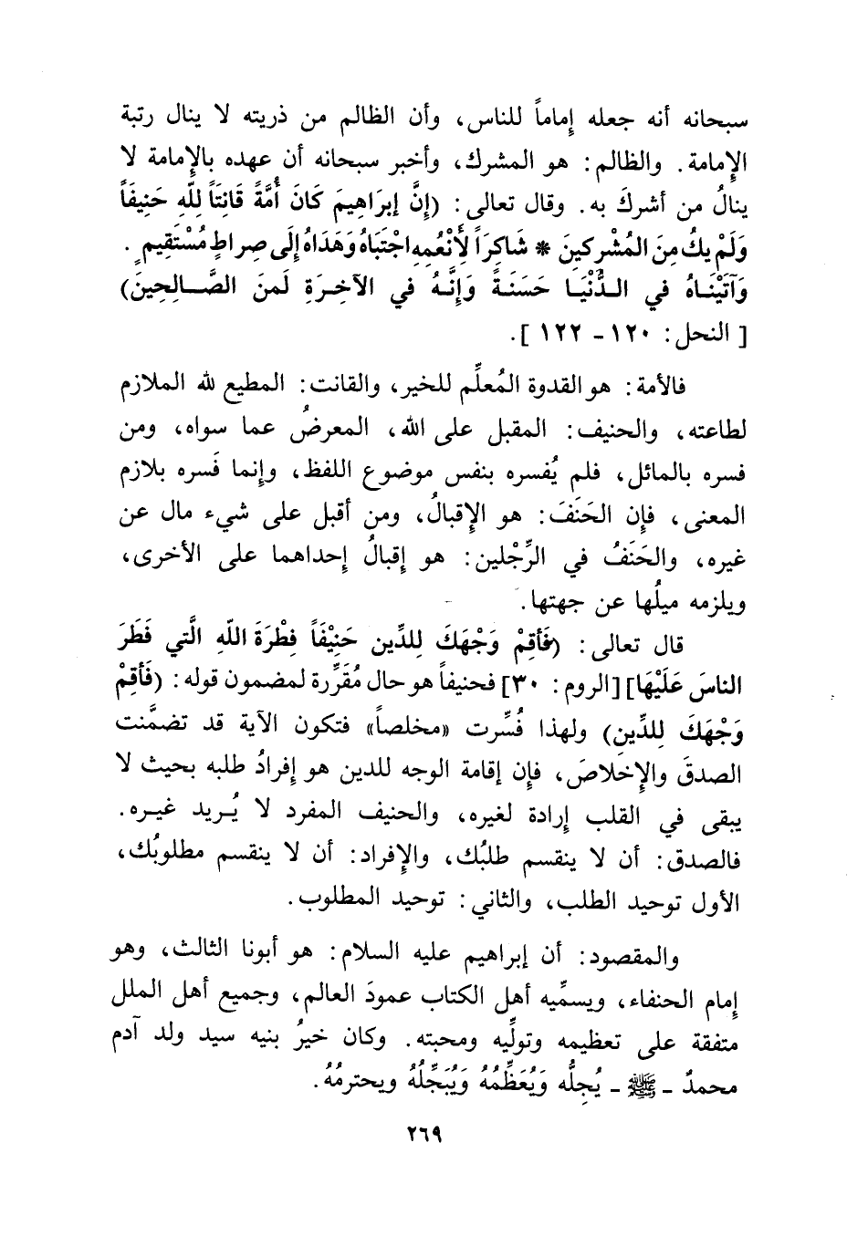 فالأمة هُوَ الْقدْوَة الْمعلم للخير وَالْقَانِت الْمُطِيع لله الملازم لطاعته والحنيف الْمقبل على الله المعرض عَمَّا سواهُ وَمن فسره بالمائل فَلم يفسره بِنَفس مَوْضُوع اللَّفْظ وَإِنَّمَا فسره بِلَازِم الْمَعْنى فَإِن الحنف هُوَ الإقبال وَمن أقبل على شَيْء مَال عَن غَيره والحنف فِي الرجلَيْن هُوَ إقبال إِحْدَاهمَا على الْأُخْرَى وَيلْزمهُ ميلها عَن جِهَتهَا