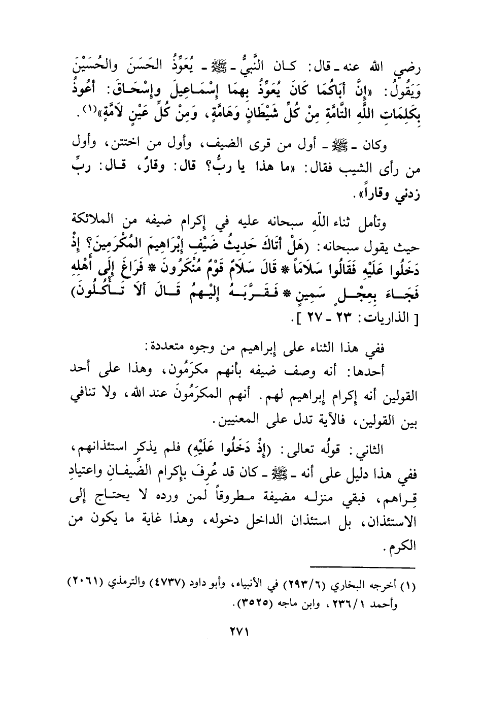 وَتَأمل ثَنَاء الله سُبْحَانَهُ عَلَيْهِ فِي اكرام ضَيفه من الْمَلَائِكَة حَيْثُ يَقُول سُبْحَانَهُ {هَلْ أَتَاكَ حَدِيث ضيف إِبْرَاهِيم الْمُكْرَمِينَ إِذْ دَخَلُوا عَلَيْهِ فَقَالُوا سَلاماً قَالَ سَلامٌ قَوْمٌ مُنْكَرُونَ فَرَاغَ إِلَى أَهْلِهِ فَجَاءَ بِعِجْلٍ سَمِينٍ فَقَرَّبَهُ إِلَيْهِمْ قَالَ أَلا تَأْكُلُونَ} الذاريات 23 27