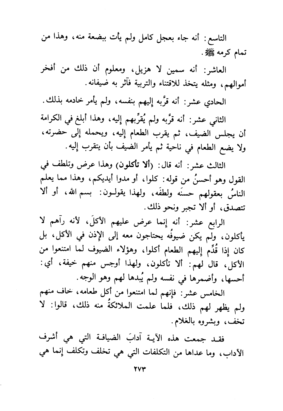 الثَّالِث عشر أَنه قَالَ {أَلا تَأْكُلُونَ} وَهَذَا عرض وتلطف فِي القَوْل وَهُوَ أحسن من قَوْله كلوا أَو مدوا ايديكم وَهَذَا مِمَّا يعلم النَّاس بعقولهم حسنه ولطفه وَلِهَذَا يَقُولُونَ بِسم الله أَو أَلا تَتَصَدَّق أَو أَلا تجبر وَنَحْو ذَلِك