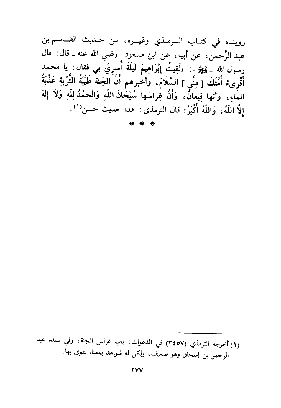 روينَاهُ فِي كتاب التِّرْمِذِيّ وَغَيره من حَدِيث الْقَاسِم بن عبد الرَّحْمَن عَن أَبِيه عَن ابْن مَسْعُود رَضِي الله عَنهُ قَالَ قَالَ رَسُول الله صلى الله عَلَيْهِ وَسلم لقِيت إِبْرَاهِيم لَيْلَة أسرِي بِي فَقَالَ يَا مُحَمَّد اقرئ امتك مني السَّلَام وَأخْبرهمْ أَن الْجنَّة طيبَة التربة عذبة المَاء وَأَنَّهَا قيعان وَأَن غراسها سُبْحَانَ الله وَالْحَمْد لله وَلَا إِلَه إِلَّا الله وَالله أكبر قَالَ التِّرْمِذِيّ هَذَا حَدِيث حسن