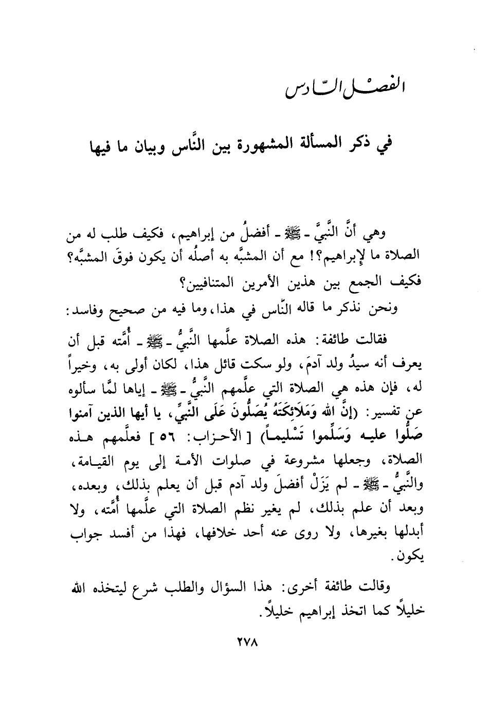 فَقَالَت طَائِفَة هَذِه الصَّلَاة علمهَا النَّبِي صلى الله عَلَيْهِ وَسلم أمته قبل أَن يعرف أَنه سيد ولد آدم وَلَو سكت قَائِل هَذَا لَكَانَ أولى بِهِ وَخيرا لَهُ فَإِن هَذِه هِيَ الصَّلَاة الَّتِي علمهمْ النَّبِي صلى الله عَلَيْهِ وَسلم إِيَّاهَا لما سَأَلُوهُ عَن تَفْسِير {إِنَّ اللَّهَ وَمَلَائِكَته يصلونَ على النَّبِيِّ يَا أَيُّهَا الَّذين آمنُوا صلوا عَلَيْهِ وَسَلِّمُوا تَسْلِيماً} الْأَحْزَاب 56 فعلمهم هَذِه الصَّلَاة وَجعلهَا مَشْرُوعَة فِي صلوَات الْأمة إِلَى يَوْم الْقِيَامَة وَالنَّبِيّ صلى الله عَلَيْهِ وَسلم لم يزل أفضل ولد آدم قبل أَن يعلم بذلك وَبعده وَبعد أَن علم بذلك لم يُغير نظم الصَّلَاة الَّتِي علمهَا أمته وَلَا أبدلها بغَيْرهَا وَلَا روى عَنهُ أحد خلَافهَا فَهَذَا من أفسد جَوَاب يكون