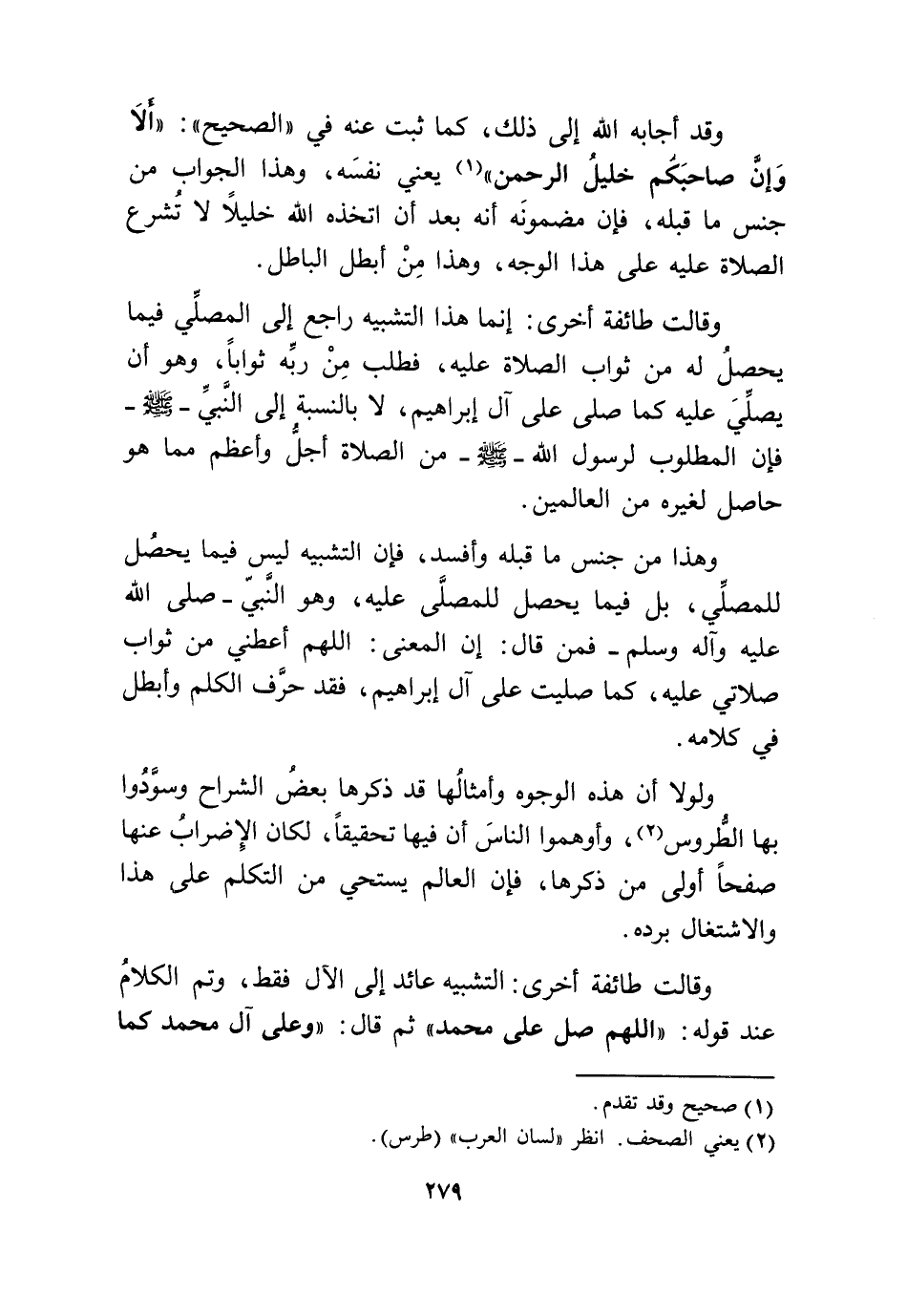 وَقَالَت طَائِفَة أُخْرَى التَّشْبِيه عَائِد إِلَى الْآل فَقَط وَتمّ الْكَلَام عِنْد قَوْله اللَّهُمَّ صل على مُحَمَّد ثمَّ قَالَ وعَلى آل مُحَمَّد كَمَا