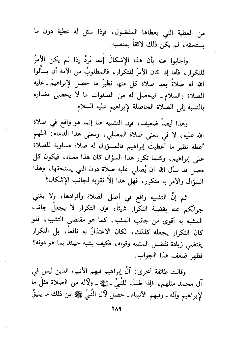 وَهَذَا أَيْضا ضَعِيف فَإِن التَّشْبِيه هُنَا إِنَّمَا هُوَ وَاقع فِي صَلَاة الله عَلَيْهِ لَا فِي معنى صَلَاة الْمُصَلِّي وَمعنى هَذَا الدُّعَاء اللَّهُمَّ أعْطه نَظِير مَا أَعْطَيْت إِبْرَاهِيم فالمسؤول لَهُ صَلَاة مُسَاوِيَة للصَّلَاة على إِبْرَاهِيم وَكلما تكَرر هَذَا السُّؤَال كَانَ هَذَا مَعْنَاهُ فَيكون كل مصل قد سَأَلَ الله أَن يُصَلِّي عَلَيْهِ صَلَاة دون الَّتِي يَسْتَحِقهَا وَهَذَا السُّؤَال وَالْأَمر بِهِ متكرر فَهَل هَذَا إِلَّا تَقْوِيَة لجَانب الْإِشْكَال