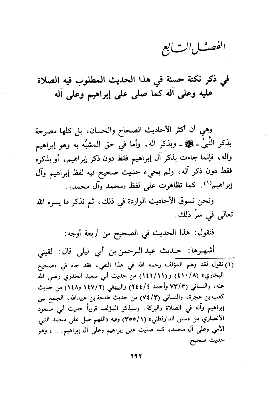 وَهِي أَن أَكثر الْأَحَادِيث الصِّحَاح والحسان بل كلهَا مصرحة بِذكر النَّبِي صلى الله عَلَيْهِ وَسلم وبذكر آله وَأما فِي حق الْمُشبه بِهِ وَهُوَ إِبْرَاهِيم وَآله فَإِنَّمَا جَاءَت بِذكر آل إِبْرَاهِيم فَقَط دون ذكر إِبْرَاهِيم أَو بِذكرِهِ فَقَط دون ذكر آله وَلم يَجِيء حَدِيث صَحِيح فِيهِ لفظ إِبْرَاهِيم وَآل إِبْرَاهِيم كَمَا تظاهرت على لفظ مُحَمَّد وَآل مُحَمَّد
