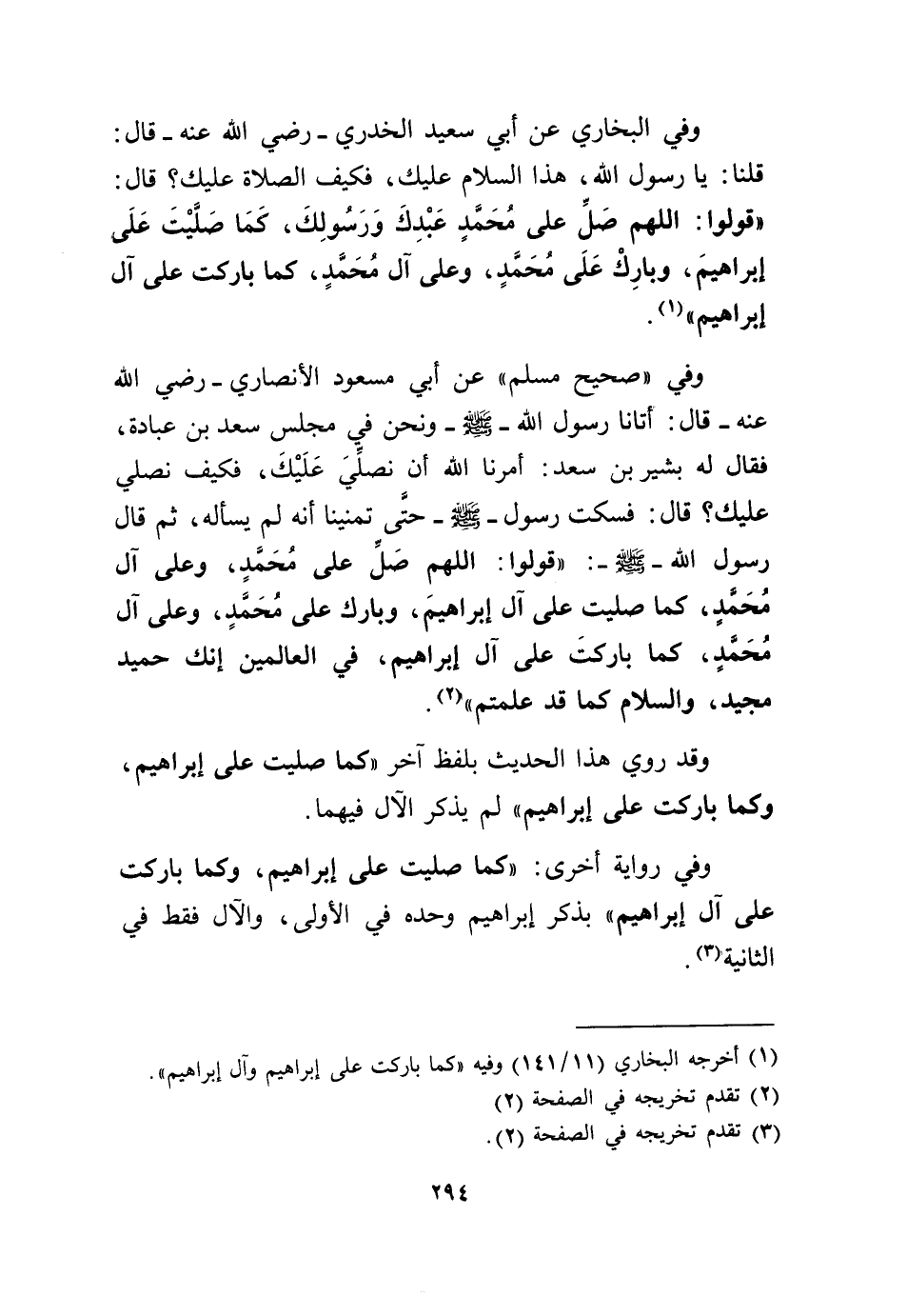 وَفِي البُخَارِيّ عَن أبي سعيد الْخُدْرِيّ رَضِي الله عَنهُ قَالَ قُلْنَا يَا رَسُول الله هَذَا السَّلَام عَلَيْك فَكيف الصَّلَاة عَلَيْك قَالَ قُولُوا اللَّهُمَّ صل على مُحَمَّد عَبدك وَرَسُولك كَمَا صليت على إِبْرَاهِيم وَبَارك على مُحَمَّد وعَلى آل مُحَمَّد كَمَا باركت على آل إِبْرَاهِيم