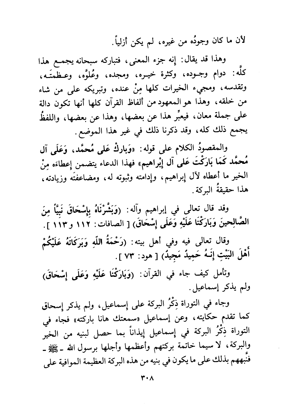 وَالْمَقْصُود الْكَلَام على قَوْله وَبَارك على مُحَمَّد وعَلى آل مُحَمَّد كَمَا باركت على آل إِبْرَاهِيم فَهَذَا الدُّعَاء يتَضَمَّن إعطاءه من الْخَيْر مَا أعطَاهُ لآل إِبْرَاهِيم وإدامته وثبوته لَهُ ومضاعفته وزيادته هَذَا حَقِيقَة الْبركَة