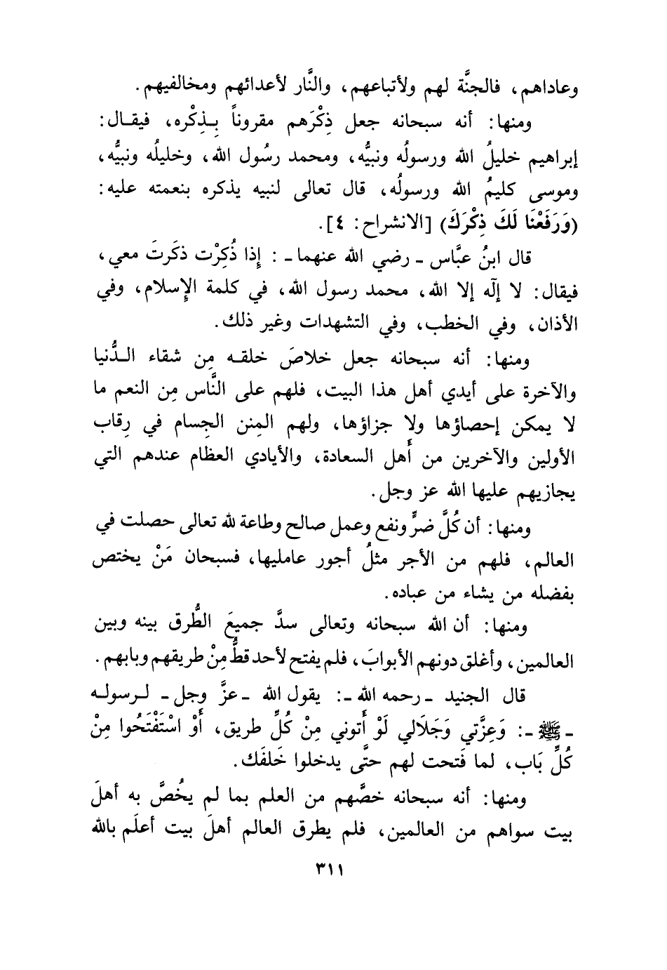 وَمِنْهَا أَنه سُبْحَانَهُ جعل ذكرهم مَقْرُونا بِذكرِهِ فَيُقَال إِبْرَاهِيم خَلِيل الله وَرَسُوله وَنبيه وَمُحَمّد رَسُول الله وخليله وَنبيه ومُوسَى كليم الله وَرَسُوله قَالَ تَعَالَى لنَبيه يذكرهُ بنعمته عَلَيْهِ {وَرَفَعْنَا لَك ذكرك} الانشراح 4