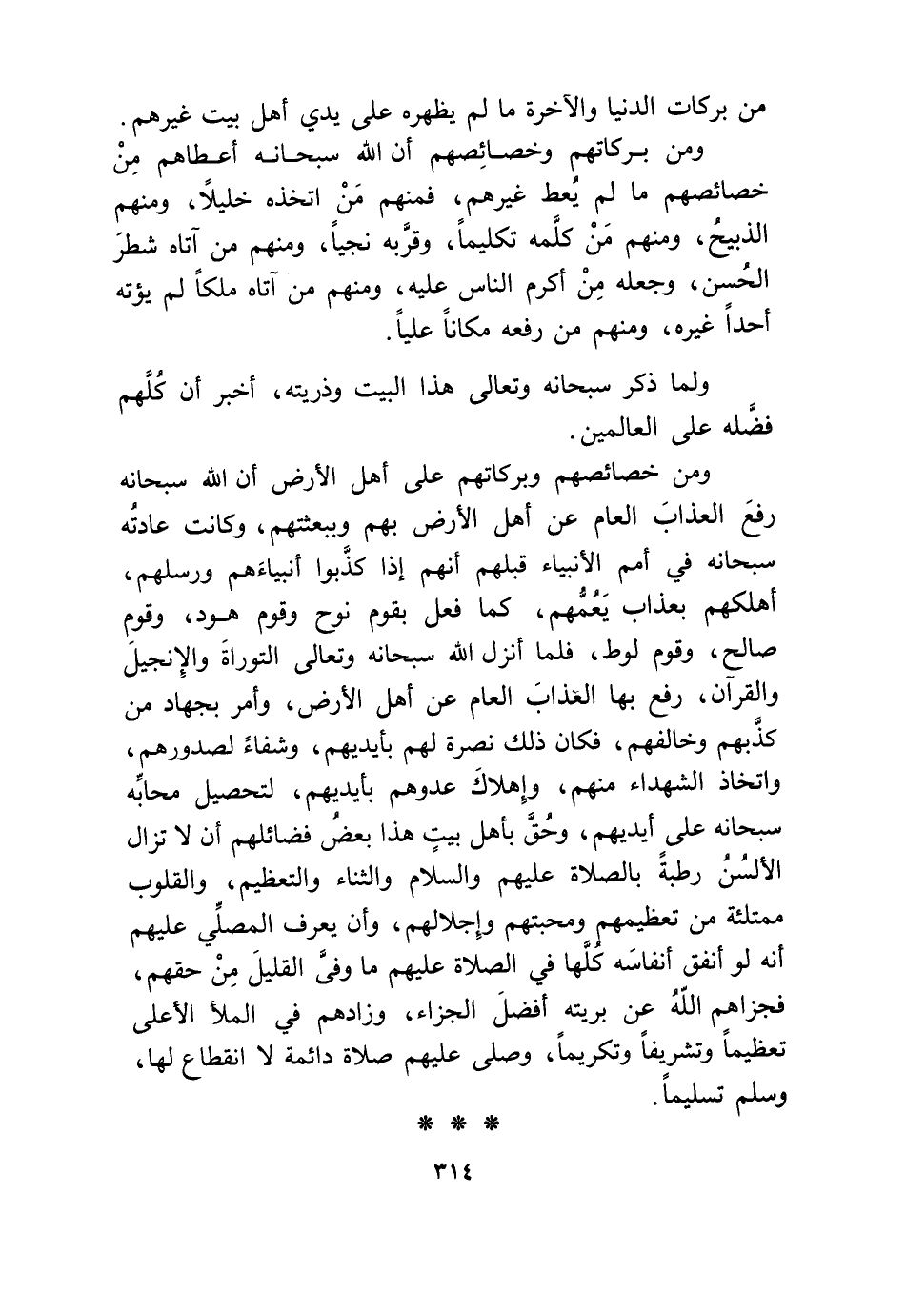 وَمن خصائصهم وبركاتهم على أهل الأَرْض أَن الله سُبْحَانَهُ رفع الْعَذَاب الْعَام عَن أهل الأَرْض بهم وببعثتهم وَكَانَت عَادَته سُبْحَانَهُ فِي أُمَم الْأَنْبِيَاء قبلهم أَنهم إِذا كذبُوا أنبياءهم ورسلهم أهلكهم بِعَذَاب يعمهم كَمَا فعل بِقوم نوح وَقوم هود وَقوم صَالح وَقوم لوط فَلَمَّا أنزل الله سُبْحَانَهُ وَتَعَالَى التَّوْرَاة وَالْإِنْجِيل وَالْقُرْآن رفع بهَا الْعَذَاب الْعَام عَن أهل الأَرْض وَأمر بجهاد من كذبهمْ وَخَالفهُم فَكَانَ ذَلِك نصْرَة لَهُم بِأَيْدِيهِم وشفاء لصدورهم واتخاذ الشُّهَدَاء مِنْهُم وإهلاك عدوهم بِأَيْدِيهِم لتَحْصِيل محابه سُبْحَانَهُ على ايديهم وَحقّ بِأَهْل بَيت هَذَا بعض فضائلهم أَن لَا تزَال الألسن رطبَة بِالصَّلَاةِ عَلَيْهِم وَالسَّلَام وَالثنَاء والتعظيم والقلوب ممتلئة من تعظيمهم ومحبتهم وإجلالهم وَأَن يعرف الْمُصَلِّي عَلَيْهِم أَنه لَو أنْفق أنفاسه كلهَا فِي الصَّلَاة عَلَيْهِم مَا وفى الْقَلِيل من حَقهم فجزاهم الله عَن بريته أفضل الْجَزَاء وَزَادَهُمْ فِي الْمَلأ الْأَعْلَى تَعْظِيمًا وتشريفاً وتكريما وَصلى عَلَيْهِم صَلَاة دائمة لَا انْقِطَاع لَهَا وَسلم تَسْلِيمًا