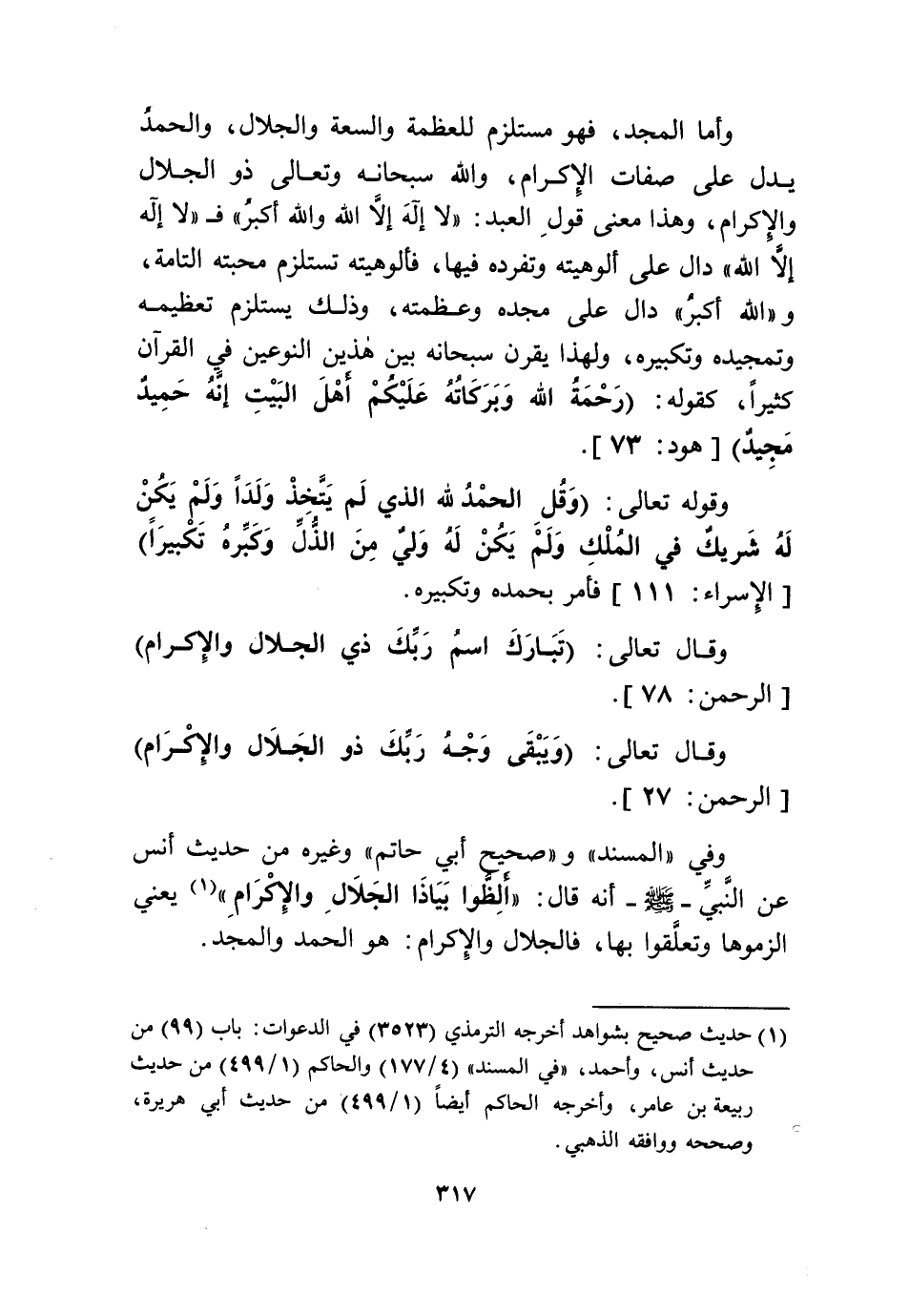 وَفِي الْمسند وصحيح أبي حَاتِم وَغَيره من حَدِيث أنس عَن النَّبِي صلى الله عَلَيْهِ وَسلم أَنه قَالَ أَلظُّوا بِيَاذَا الْجلَال وَالْإِكْرَام حَدِيث صَحِيح يَعْنِي الزموها وتعلقوا بهَا فالجلال وَالْإِكْرَام هُوَ الْحَمد وَالْمجد