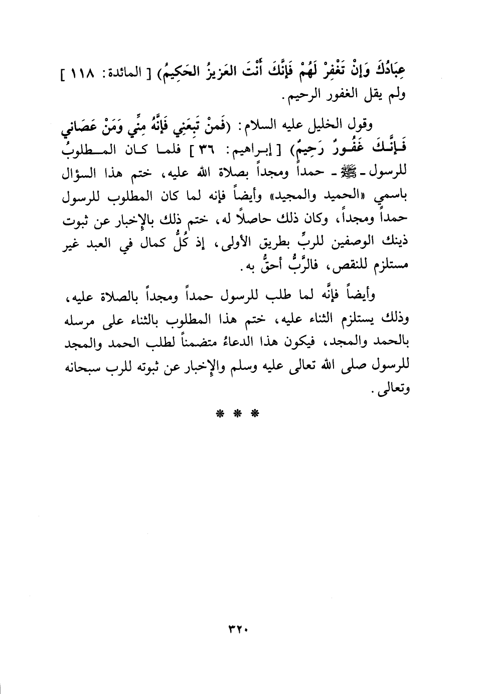 وَقَول الْخَلِيل عَلَيْهِ السَّلَام {فَمَنْ تَبِعَنِي فَإِنَّهُ مِنِّي وَمَنْ عَصَانِي فَإِنَّكَ غَفُورٌ رَحِيمٌ} إِبْرَاهِيم 36 فَلَمَّا كَانَ الْمَطْلُوب للرسول صلى الله عَلَيْهِ وَسلم حمداً ومجداً بِصَلَاة الله عَلَيْهِ ختم هَذَا السُّؤَال باسمي الحميد والمجيد وَأَيْضًا فَإِنَّهُ لما كَانَ الْمَطْلُوب للرسول حمداً ومجداً وَكَانَ ذَلِك حَاصِلا لَهُ ختم ذَلِك بالإخبار عَن ثُبُوت ذنيك الوصفين للرب بطرِيق الأولى إِذْ كل كَمَال فِي العَبْد غير مُسْتَلْزم للنقص فالرب أَحَق بِهِ