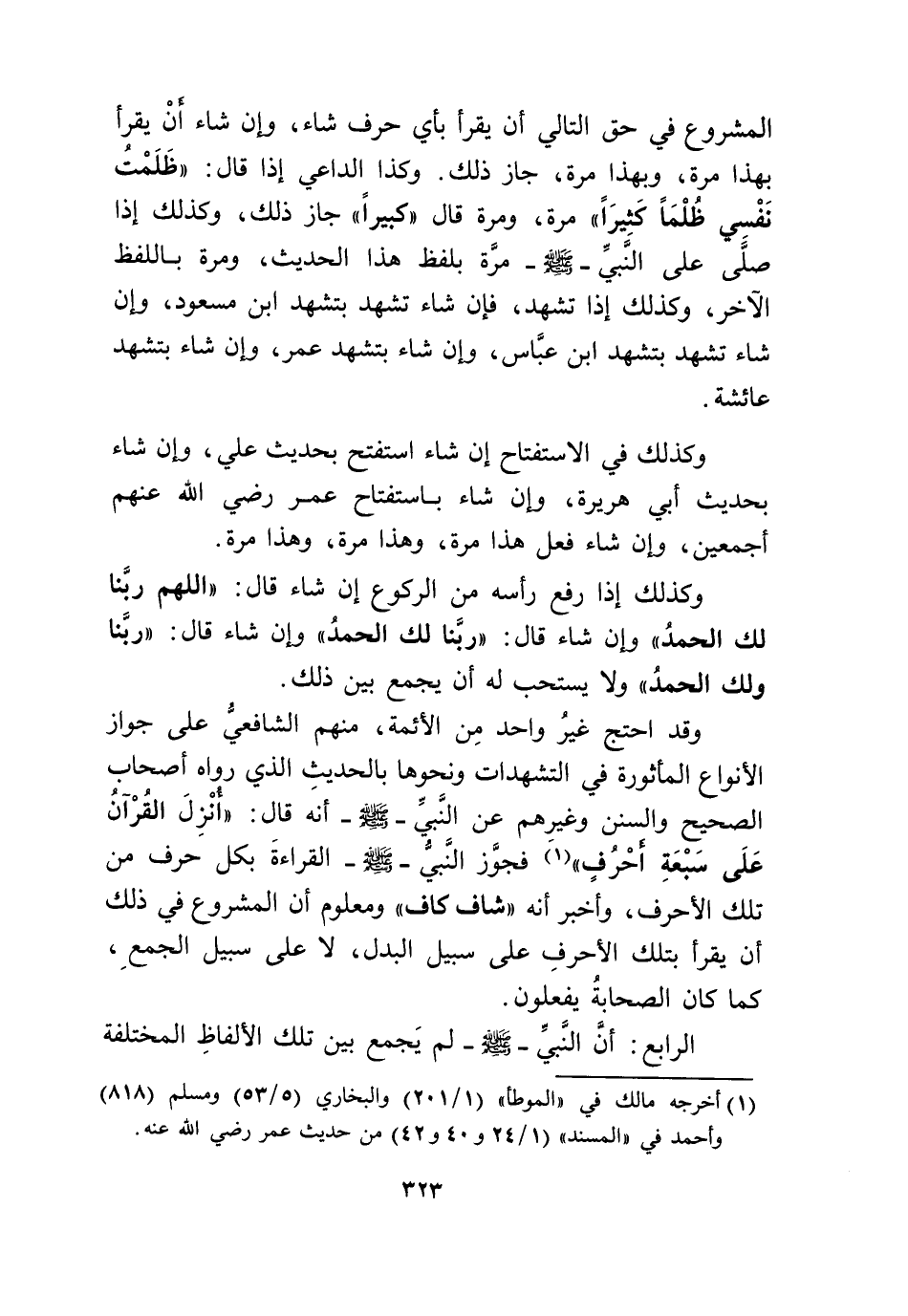 وَقد احْتج غير وَاحِد من الْأَئِمَّة مِنْهُم الشَّافِعِي على جَوَاز الْأَنْوَاع المأثورة فِي التشهدات وَنَحْوهَا بِالْحَدِيثِ الَّذِي رَوَاهُ أَصْحَاب الصَّحِيح وَالسّنَن وَغَيرهم عَن النَّبِي صلى الله عَلَيْهِ وَسلم أَنه قَالَ أنزل الْقُرْآن على سَبْعَة أحرف فجوز النَّبِي صلى الله عَلَيْهِ وَسلم الْقِرَاءَة بِكُل حرف من تِلْكَ الأحرف وَأخْبر أَنه شاف كَاف وَمَعْلُوم أَن الْمَشْرُوع فِي ذَلِك أَن يقْرَأ بِتِلْكَ الأحرف على سَبِيل الْبَدَل لَا على سَبِيل الْجمع كَمَا كَانَ الصَّحَابَة يَفْعَلُونَ