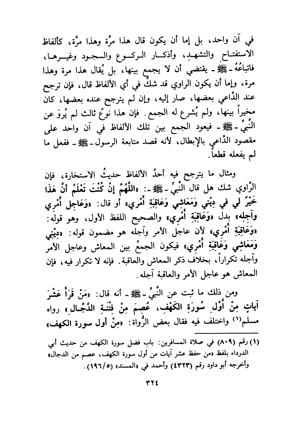 وَمِثَال مَا يتَرَجَّح فِيهِ أحد الْأَلْفَاظ حَدِيث الاستخارة فَإِن الرَّاوِي شكّ هَل قَالَ النَّبِي صلى الله عَلَيْهِ وَسلم اللَّهُمَّ أَنْت كنت تعلم أَن هَذَا خير لي فِي ديني ومعاشي وعاقبة أَمْرِي أَو قَالَ وعاجل أَمْرِي وآجله بدل وعاقبة أَمْرِي وَالصَّحِيح اللَّفْظ الأول وَهُوَ قَوْله وعاقبة أَمْرِي لِأَن عَاجل الْأَمر وآجله هُوَ مَضْمُون قَوْله ديني ومعاشي وعاقبة أَمْرِي فَيكون الْجمع بَين المعاش وعاجل الْأَمر وآجله تَكْرَارا بِخِلَاف ذكر المعاش وَالْعَاقبَة فَإِنَّهُ لَا تكْرَار فِيهِ فَإِن المعاش هُوَ عَاجل الْأَمر وَالْعَاقبَة آجله
