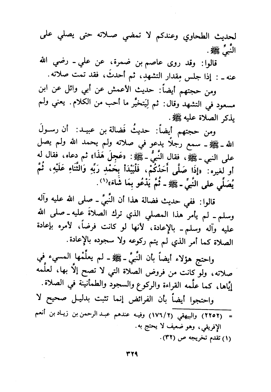 لحَدِيث الطَّحَاوِيّ وعندكم لَا تمْضِي صلَاته حَتَّى يصلى على النَّبِي صلى الله عَلَيْهِ وَسلم