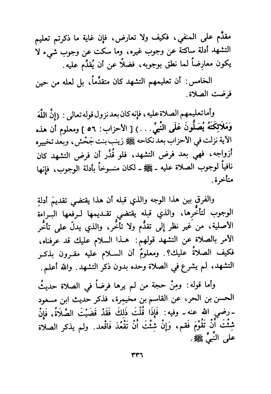 وَأما تعليمهم الصَّلَاة عَلَيْهِ فَإِنَّهُ كَانَ بعد نزُول قَوْله تَعَالَى {إِنَّ اللَّهَ وَمَلَائِكَته يصلونَ على النَّبِي} الْأَحْزَاب 56 وَمَعْلُوم أَن هَذِه الْآيَة نزلت فِي الْأَحْزَاب بعد نِكَاحه صلى الله عَلَيْهِ وَسلم زَيْنَب بنت جحش بعد تخييره أَزوَاجه فَهِيَ بعد فرض التَّشَهُّد فَلَو قدر أَن فرض التَّشَهُّد كَانَ نافياً لوُجُوب الصَّلَاة عَلَيْهِ صلى الله عَلَيْهِ وَسلم لَكَانَ مَنْسُوخا بأدلة الْوُجُوب فَإِنَّهَا مُتَأَخِّرَة