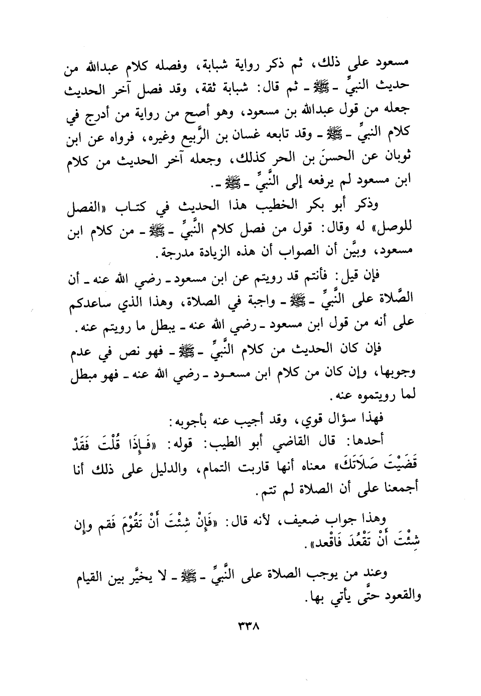 فَإِن قيل فَأنْتم قد رويتم عَن ابْن مَسْعُود رَضِي الله عَنهُ أَن الصَّلَاة على النَّبِي صلى الله عَلَيْهِ وَسلم وَاجِبَة فِي الصَّلَاة وَهَذَا الَّذِي ساعدكم على أَنه من قَول ابْن مَسْعُود رَضِي الله عَنهُ يبطل مَا رويتم عَنهُ