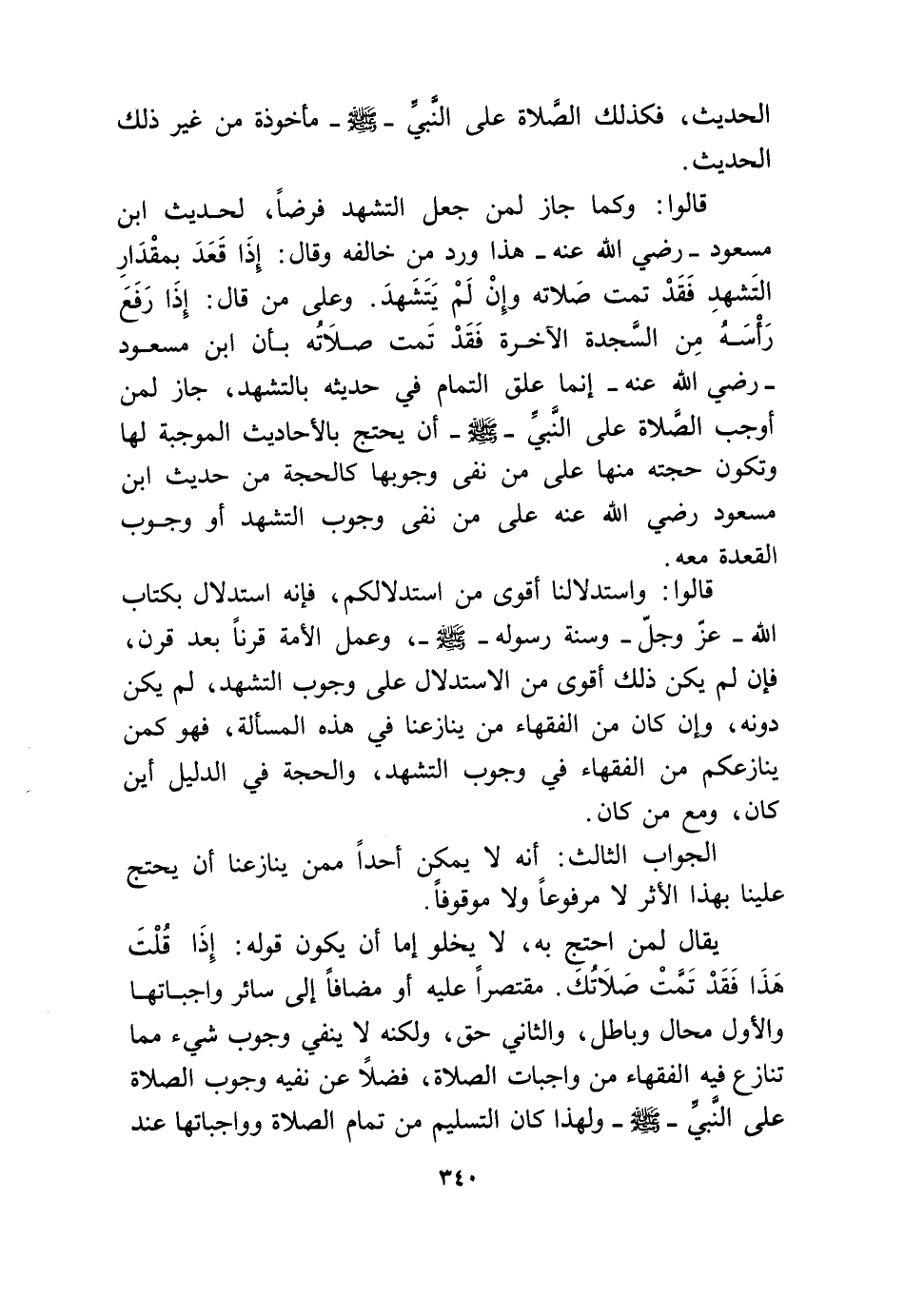 قَالُوا وكما جَازَ لمن جعل التَّشَهُّد فرضا لحَدِيث ابْن مَسْعُود رَضِي الله عَنهُ هَذَا ورد من خَالفه وَقَالَ إِذا قعد بِمِقْدَار التَّشَهُّد فقد تمت صلَاته وَإِن لم يتَشَهَّد وعَلى من قَالَ إِذا رفع رَأسه من السَّجْدَة الْآخِرَة فقد تمت صلَاته بِأَن ابْن مَسْعُود رَضِي الله عَنهُ إِنَّمَا علق التَّمام فِي حَدِيثه بالتشهد جَازَ لمن أوجب الصَّلَاة على النَّبِي صلى الله عَلَيْهِ وَسلم إِن يحْتَج بالأحاديث الْمُوجبَة لَهَا وَتَكون حجَّته مِنْهَا على من نفى وُجُوبهَا كالحجة من حَدِيث ابْن مَسْعُود رَضِي الله عَنهُ على من نفي وجوب التَّشَهُّد أَو وجوب الْقعدَة مَعَه
