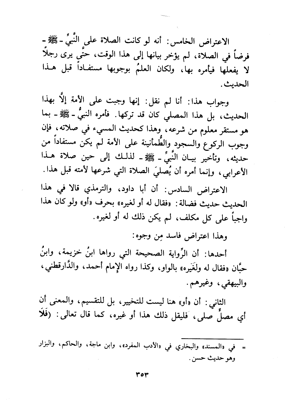الِاعْتِرَاض السَّادِس أَن أَبَا دَاوُد وَالتِّرْمِذِيّ قَالَا فِي هَذَا الحَدِيث حَدِيث فضَالة فَقَالَ لَهُ أَو لغيره بِحرف أَو وَلَو كَانَ هَذَا وَاجِبا على كل مُكَلّف لم يكن ذَلِك لَهُ أَو لغيره