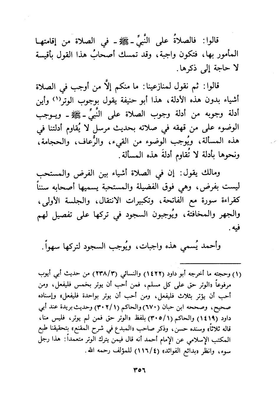 قَالُوا ثمَّ نقُول لمنازعينا مَا مِنْكُم إِلَّا من أوجب فِي الصَّلَاة أَشْيَاء بِدُونِ هَذِه الْأَدِلَّة هَذَا أَبُو حنيفَة يَقُول بِوُجُوب الْوتر وَأَيْنَ أَدِلَّة وُجُوبه من أَدِلَّة وجوب الصَّلَاة على النَّبِي صلى الله عَلَيْهِ وَسلم وَيُوجب الوضول على من قهقه فِي صلَاته بِحَدِيث مُرْسل لَا يُقَاوم أدلتنا فِي هَذِه الْمَسْأَلَة وَيُوجب الْوضُوء من الْقَيْء والرعاف والحجامة وَنَحْوهَا بأدلة لَا تقاوم أَدِلَّة هَذِه الْمَسْأَلَة