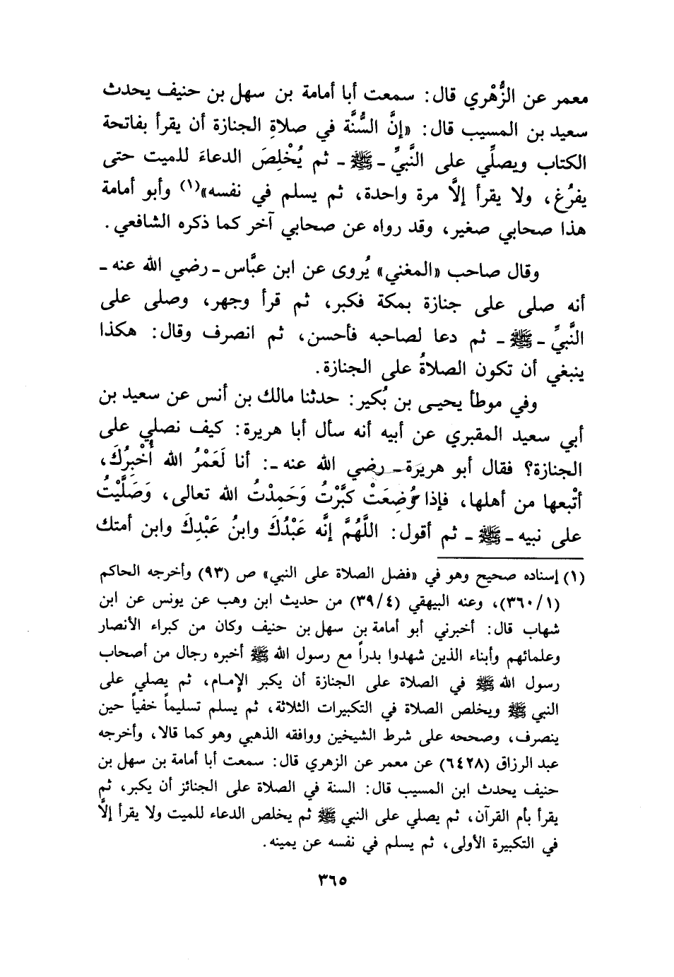 معمر عَن الزُّهْرِيّ قَالَ سَمِعت أَبَا أُمَامَة بن سهل بن حنيف يحدث سعيد بن الْمسيب قَالَ إِن السّنة فِي صَلَاة الْجِنَازَة أَن يقْرَأ بِفَاتِحَة الْكتاب وَيُصلي على النَّبِي صلى الله عَلَيْهِ وَسلم ثمَّ يخلص الدُّعَاء للْمَيت حَتَّى يفرغ وَلَا يقْرَأ إِلَّا مرّة وَاحِدَة ثمَّ يسلم فِي نَفسه // إِسْنَاده صَحِيح // وَأَبُو أُمَامَة هَذَا صَحَابِيّ صَغِير وَقد رَوَاهُ عَن صَحَابِيّ آخر كَمَا ذكره الشَّافِعِي