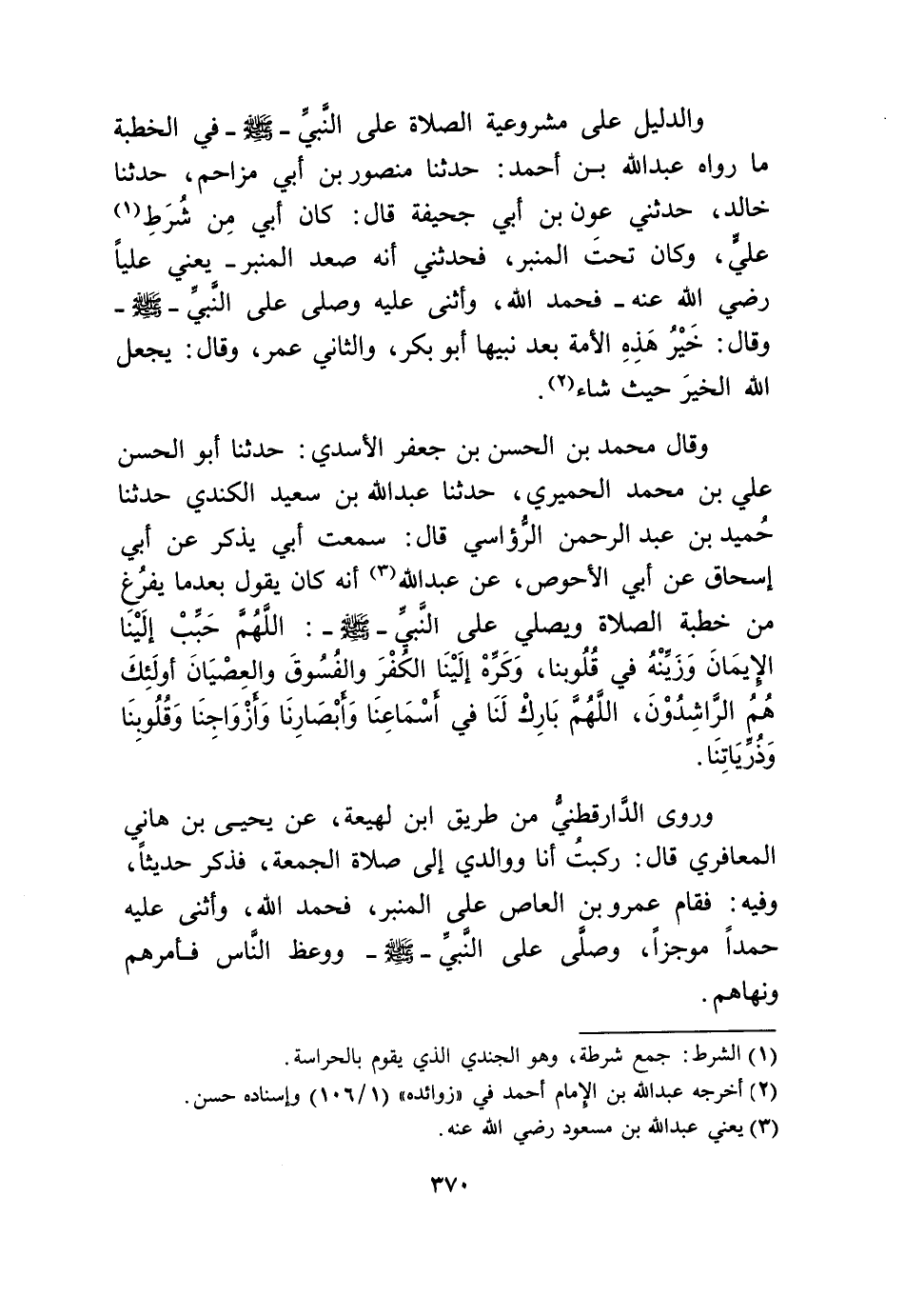 وَالدَّلِيل على مَشْرُوعِيَّة الصَّلَاة على النَّبِي صلى الله عَلَيْهِ وَسلم فِي الْخطْبَة مَا رَوَاهُ عبد الله بن أَحْمد حَدثنَا مَنْصُور بن أبي مُزَاحم حَدثنَا خَالِد حَدثنِي عون بن أبي جُحَيْفَة قَالَ كَانَ أبي من شَرط عَليّ وَكَانَ تَحت الْمِنْبَر فَحَدثني أَنه صعد الْمِنْبَر يَعْنِي عليا رَضِي الله عَنهُ فَحَمدَ الله وَأثْنى عَلَيْهِ وَصلى على النَّبِي صلى الله عَلَيْهِ وَسلم وَقَالَ خير هَذِه الْأمة بعد نبيها أَبُو بكر وَالثَّانِي عمر وَقَالَ يَجْعَل الله الْخَيْر حَيْثُ شَاءَ // إِسْنَاده حسن //