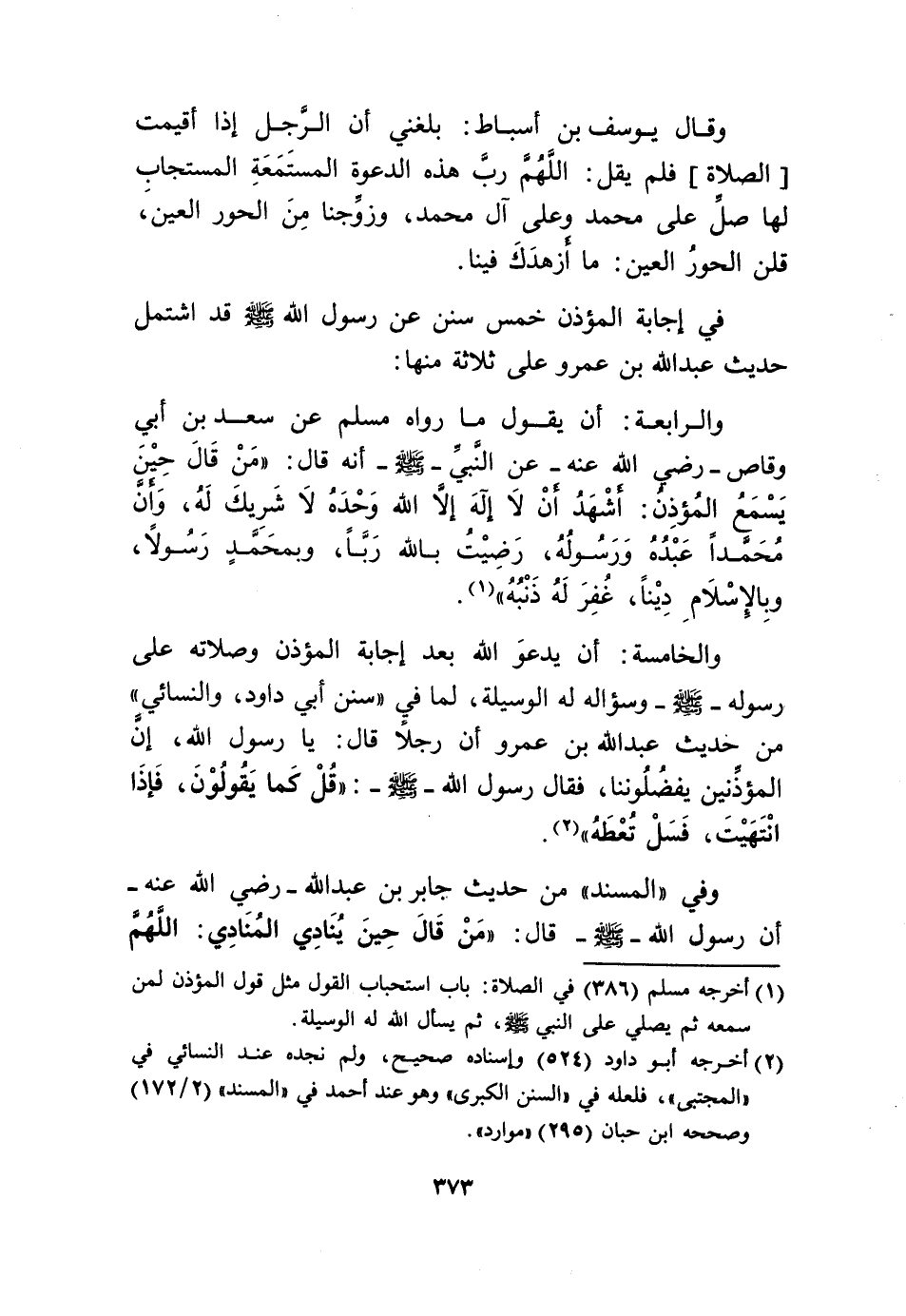 وَالْخَامِسَة أَن يَدْعُو الله بعد إِجَابَة الْمُؤَذّن وَصلَاته على رَسُوله صلى الله عَلَيْهِ وَسلم وسؤاله لَهُ الْوَسِيلَة لما فِي سنَن أبي دَاوُد وَالنَّسَائِيّ من حَدِيث عبد الله بن عَمْرو أَن رجلا قَالَ يَا رَسُول الله إِن المؤذنين يفضلوننا فَقَالَ رَسُول الله صلى الله عَلَيْهِ وَسلم قل كَمَا يَقُولُونَ فَإِذا انْتَهَيْت فسل تعطه // إِسْنَاده صَحِيح //