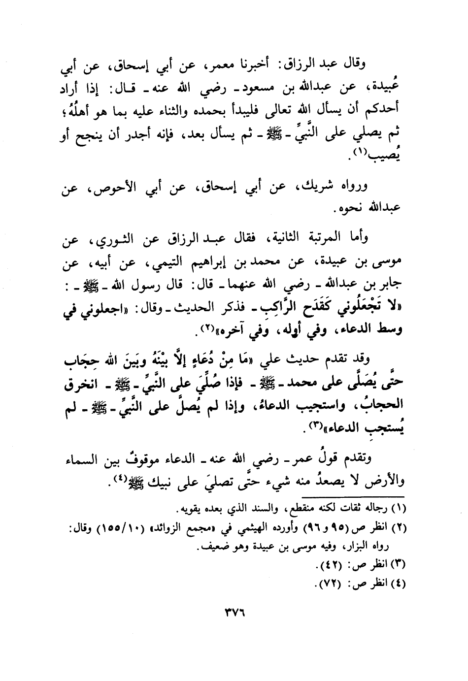 واما الْمرتبَة الثَّانِيَة فَقَالَ عبد الرَّزَّاق عَن الثَّوْريّ عَن مُوسَى بن عُبَيْدَة عَن مُحَمَّد بن إِبْرَاهِيم التَّيْمِيّ عَن أَبِيه عَن جَابر بن عبد الله رَضِي الله عَنْهُمَا قَالَ قَالَ رَسُول الله صلى الله عَلَيْهِ وَسلم لَا تجعلوني كقدح الرَّاكِب فَذكر الحَدِيث وَقَالَ اجعلوني فِي وسط الدُّعَاء وَفِي أَوله وَفِي آخِره
