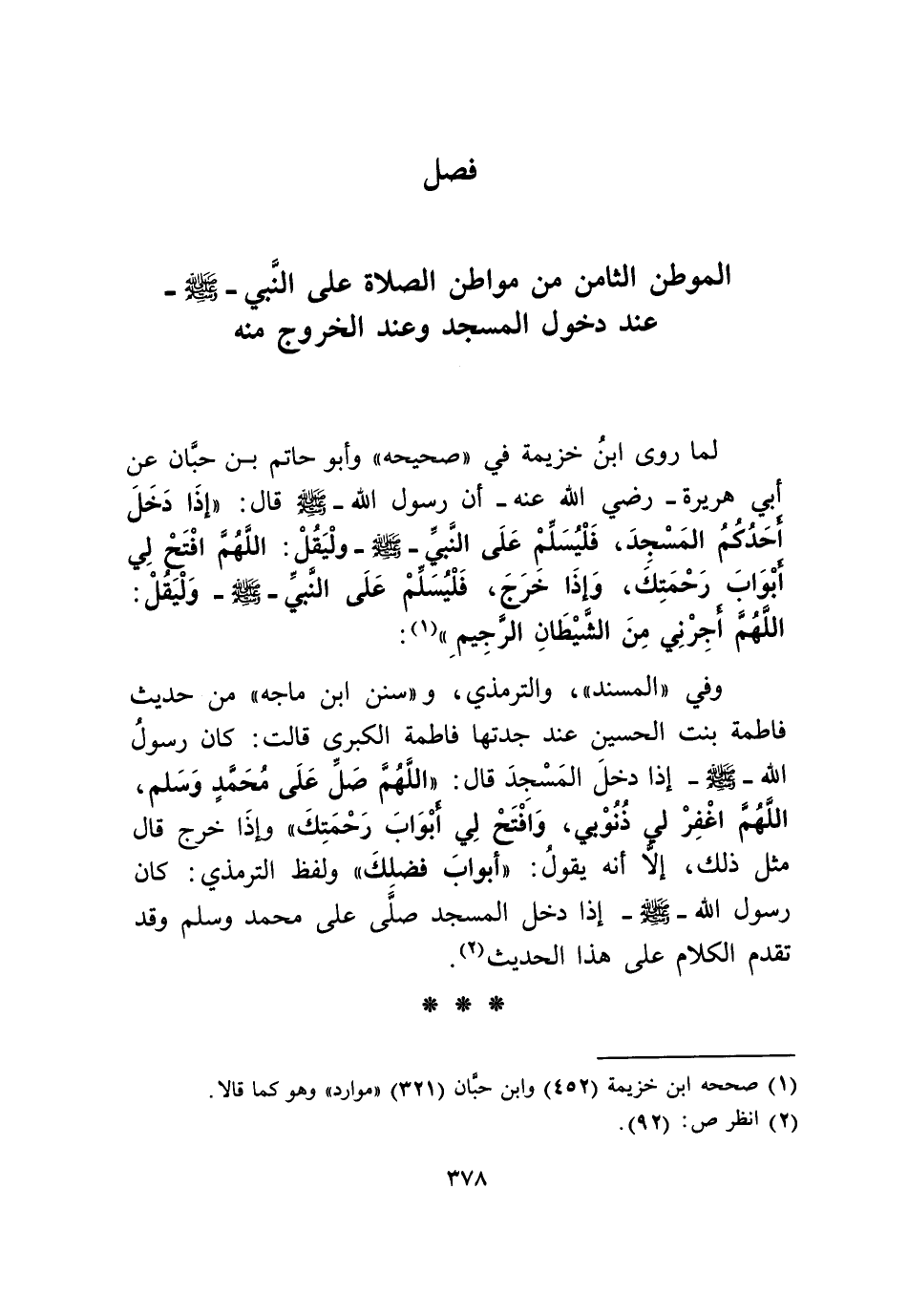 الموطن الثَّامِن من مَوَاطِن الصَّلَاة على النَّبِي صلى الله عَلَيْهِ وَسلم عِنْد دُخُول الْمَسْجِد وَعند الْخُرُوج مِنْهُ
