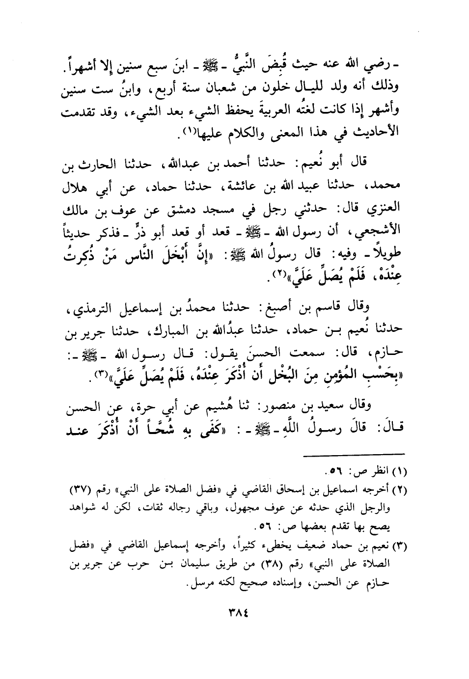 وَقَالَ قَاسم بن أصبغ حَدثنَا مُحَمَّد بن إِسْمَاعِيل التِّرْمِذِيّ حَدثنَا نعيم بن حَمَّاد حَدثنَا عبد الله بن الْمُبَارك حَدثنَا جرير بن حَازِم قَالَ سَمِعت الْحسن يَقُول قَالَ رَسُول الله صلى الله عَلَيْهِ وَسلم بِحَسب الْمُؤمن من الْبُخْل أَن أذكر عِنْده فَلم يصل عَليّ // إِسْنَاده صَحِيح //