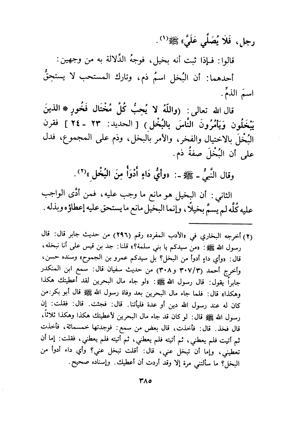 قَالَ الله تَعَالَى {وَاللَّهُ لَا يُحِبُّ كُلَّ مُخْتَالٍ فَخُورٍ الَّذِينَ يَبْخَلُونَ ويأمرون النَّاس بالبخل} الْحَدِيد 23 24 فقرن الْبُخْل بالاختيال وَالْفَخْر وَالْأَمر بالبخل وذم على الْمَجْمُوع فَدلَّ على أَن الْبُخْل صفة ذمّ