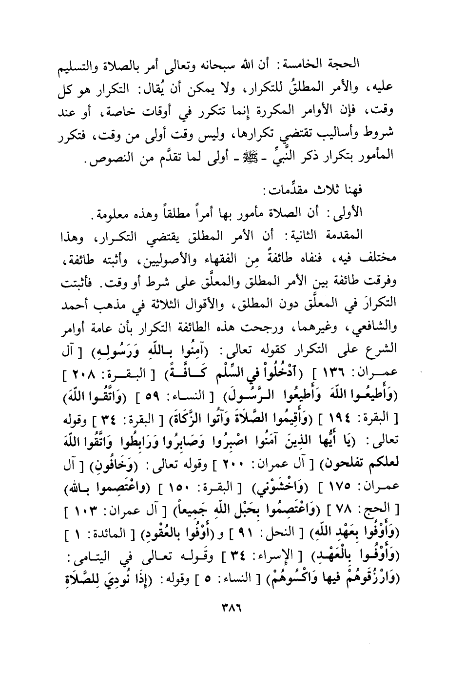 الْمُقدمَة الثَّانِيَة أَن الْأَمر الْمُطلق يَقْتَضِي التّكْرَار وَهَذَا مُخْتَلف فِيهِ فنفاه طَائِفَة من الْفُقَهَاء والأصوليين وأثبته طَائِفَة وَفرقت طَائِفَة بَين الْأَمر الْمُطلق وَالْمُعَلّق على شَرط أَو وَقت فأثبتت التّكْرَار فِي الْمُعَلق دون الْمُطلق والأقوال الثَّلَاثَة فِي مَذْهَب احْمَد وَالشَّافِعِيّ وَغَيرهمَا ورجحت هَذِه الطَّائِفَة التّكْرَار بِأَن عَامَّة أوَامِر الشَّرْع على التّكْرَار كَقَوْلِه تَعَالَى {آمِنُوا بِاللَّهِ وَرَسُوله} آل عمرَان 136 {ادْخُلُوا فِي السِّلْمِ كَافَّة} الْبَقَرَة 20 {وَأَطِيعُوا اللَّهَ وَأَطِيعُوا الرَّسُول) النِّسَاء 59 {وَاتَّقُوا اللَّهَ} الْبَقَرَة 194 {وَأَقِيمُوا الصَّلاةَ وَآتُوا الزَّكَاة} الْبَقَرَة 34 وَقَوله تَعَالَى {يَا أَيهَا الَّذين آمنُوا اصْبِرُوا وَصَابِرُوا وَرَابِطُوا وَاتَّقُوا اللَّهَ لَعَلَّكُمْ تُفْلِحُونَ} آل عمرَان 200 وَقَوله تَعَالَى {وَخَافُونِ} آل عمرَان 175 {واخشوني} الْبَقَرَة 150 {واعتصموا بِاللَّه} الْحَج 78 {وَاعْتَصِمُوا بِحَبْلِ اللَّهِ جَمِيعاً} آل عمرَان 103 {وَأَوْفُوا بِعَهْدِ اللَّهِ} النَّحْل 91 و (أَوْفوا بِالْعُقُودِ) الْمَائِدَة 1 {وأوفوا بالعهد} الْإِسْرَاء 34 وَقَوله تَعَالَى فِي الْيَتَامَى {وَارْزُقُوهُمْ فِيهَا وَاكْسُوهُمْ} النِّسَاء 5 وَقَوله {إِذَا نُودِيَ لِلصَّلاةِ مِنْ يَوْمِ الْجُمُعَةِ فَاسَعَوْا إِلَى ذِكْرِ اللَّهِ وَذَرُوا البيع}