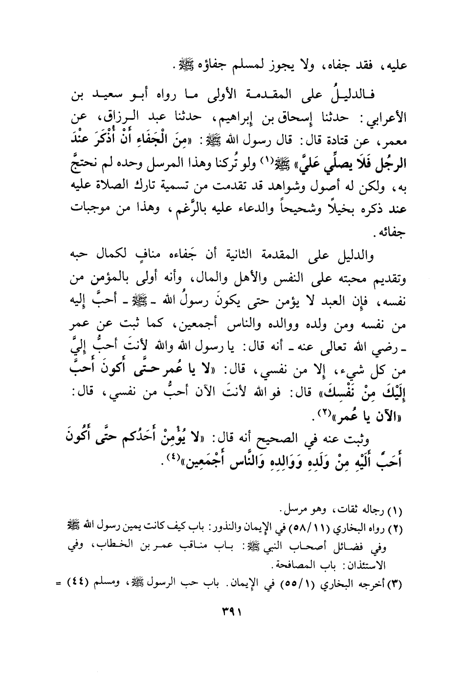 وَالدَّلِيل على الْمُقدمَة الثَّانِيَة أَن جفاءه منَاف لكَمَال حبه وَتَقْدِيم محبته على النَّفس والأهل وَالْمَال وَأَنه أولى بِالْمُؤمنِ من نَفسه فَإِن العَبْد لَا يُؤمن حَتَّى يكون رَسُول الله صلى الله عَلَيْهِ وَسلم أحب إِلَيْهِ من نَفسه وَمن وَلَده ووالده وَالنَّاس أَجْمَعِينَ كَمَا ثَبت عَن عمر رَضِي الله تَعَالَى عَنهُ أَنه قَالَ يَا رَسُول الله وَالله لأَنْت أحب إِلَى من كل شَيْء إِلَّا من نَفسِي قَالَ لَا يَا عمر حَتَّى أكون احب إِلَيْك من نَفسك قَالَ فو الله لأَنْت الْآن أحب من نَفسِي قَالَ الْآن يَا عمر